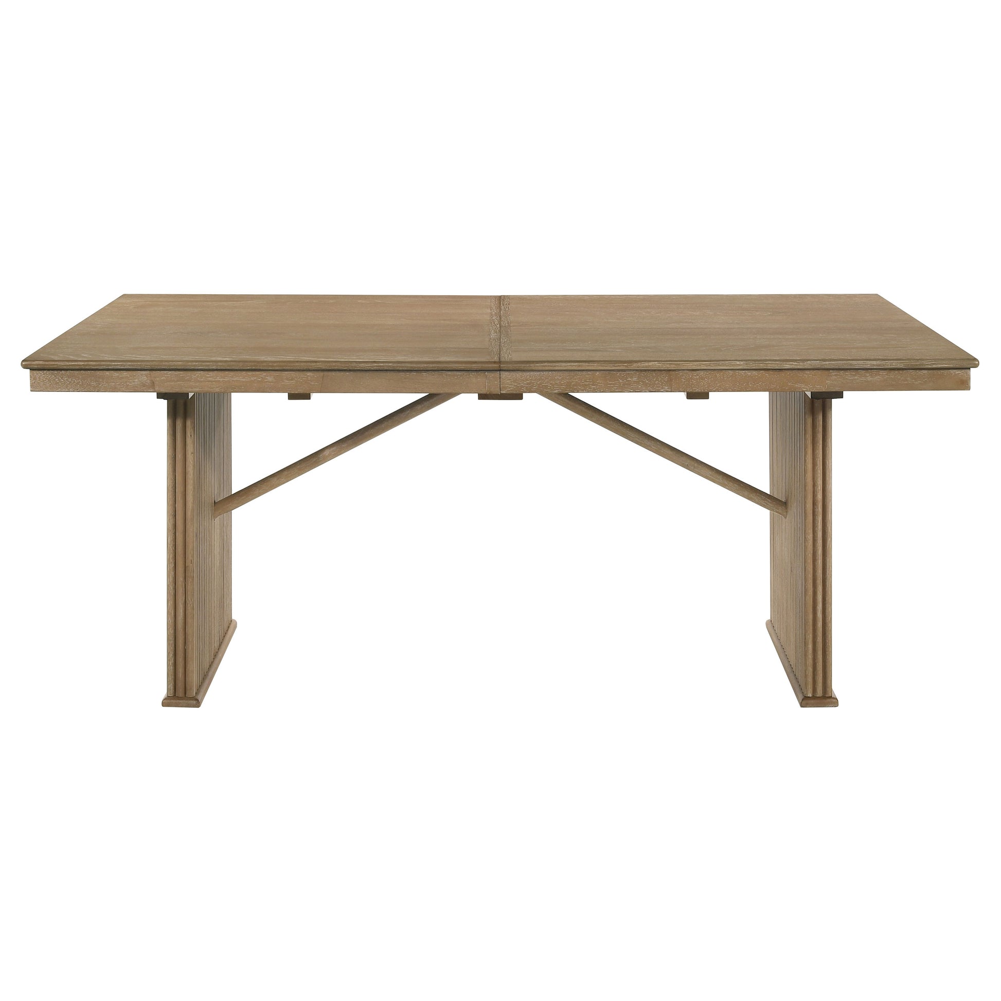 This dining table in a distressed light brown finish combines modern elegance with natural textures. Crafted from oak veneer, rubberwood, and engineered wood, the table boasts a sturdy and stylish design. The base features striking vertical reeding side panels that add a touch of texture and visual interest. Designed for both intimate meals and larger gatherings, the table includes an extension leaf for versatile seating. Its clean lines and unique base make it a perfect centerpiece for contemporary dining spaces.