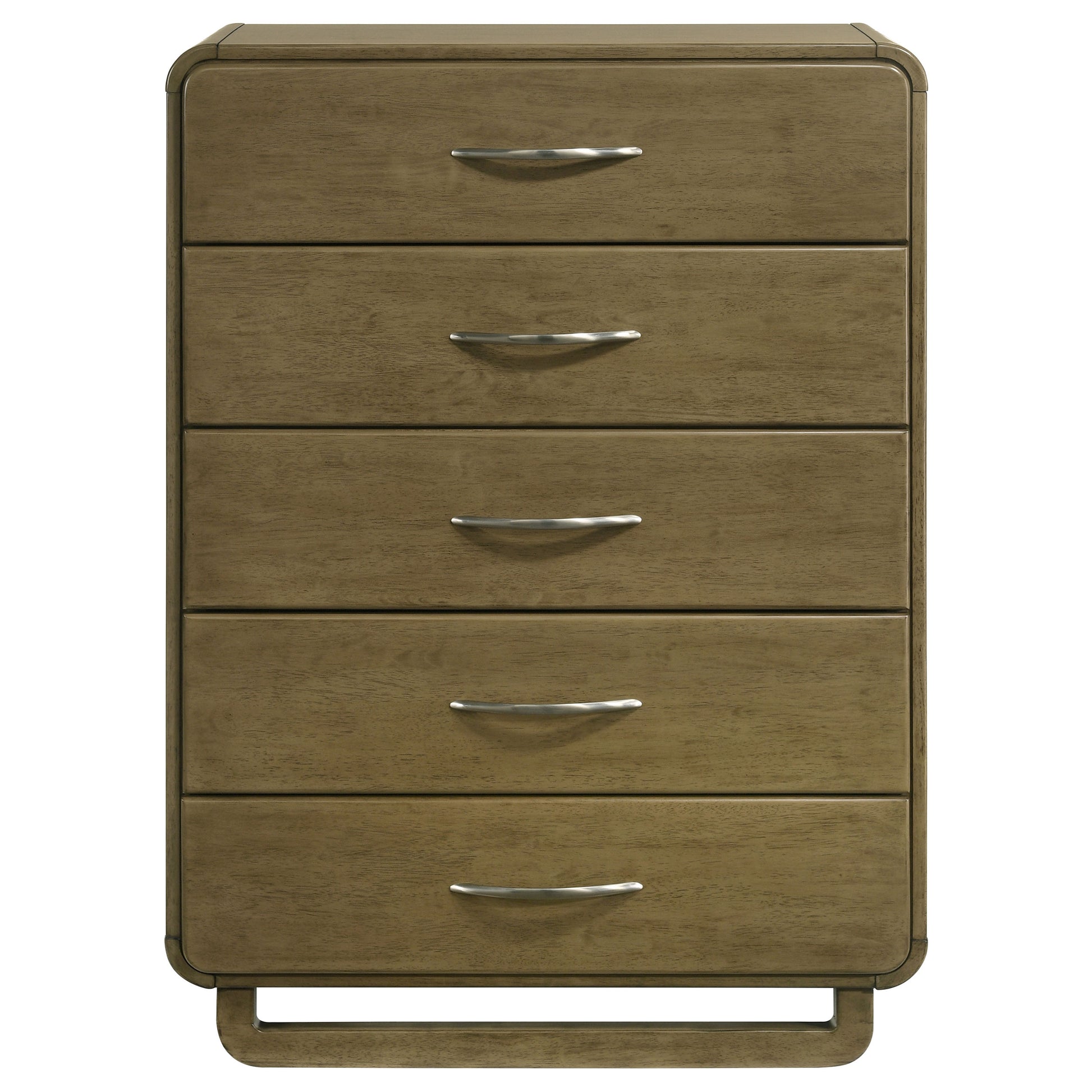 This five-drawer chest provides ample storage space while maintaining a sleek, contemporary aesthetic. The nutmeg wood finish offers a rich and inviting feel, while the rounded corners soften the design for a modern look. Each drawer is fitted with metal extension glides, ensuring smooth operation and easy access. The minimalist matte nickel hardware adds a refined touch to the chest's clean lines. Made from solid rubberwood, this chest combines practicality with modern design for a stylish and functional addition to your bedroom.