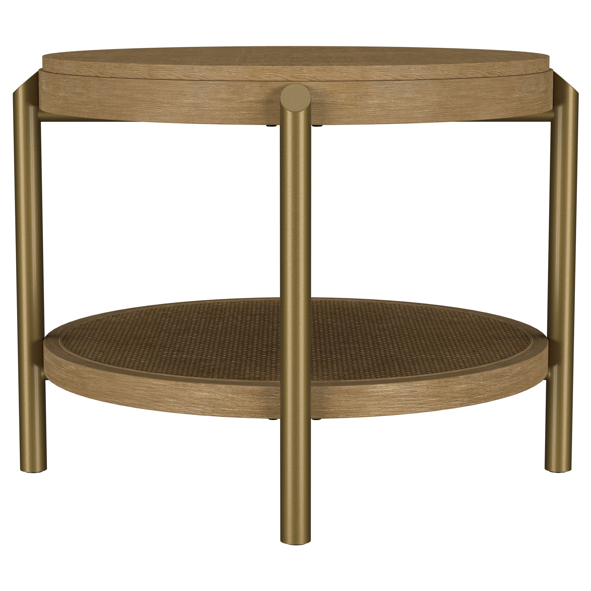 This round end table showcases a refined blend of natural and industrial elements, perfect for modern interiors. Crafted from rubberwood, engineered wood, and ash veneer, its finish highlights the table's organic grain for a subtle, rustic appeal. The lower shelf features natural woven rattan, offering functional storage with a stylish touch. Sturdy aged brass-finished metal legs provide contrast and durability. Ideal as a side table or accent piece, it combines elegance and utility effortlessly.