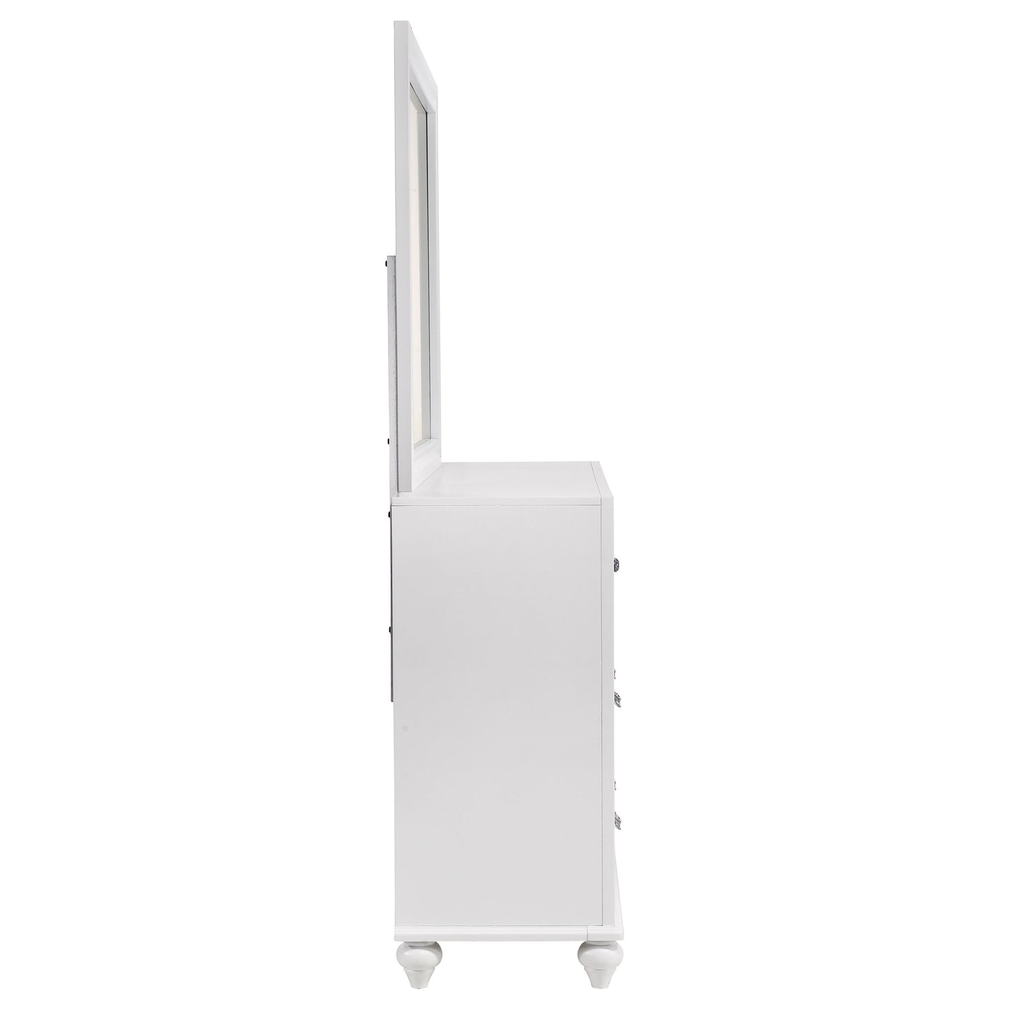 Elevate your bedroom with the glamorous appeal of this dresser and mirror set. The seven-drawer dresser showcases sparkling acrylic panels on its top drawers, complemented by faceted crystal hardware for radiant elegance. A crisp white finish highlights its clean silhouette, while turned bun feet add a timeless touch. The coordinating mirror features a beveled wooden frame that reflects light beautifully, enhancing the dresser’s bold style. Built with solid rubberwood, engineered wood, and okume veneer, this set balances chic design with lasting durability.