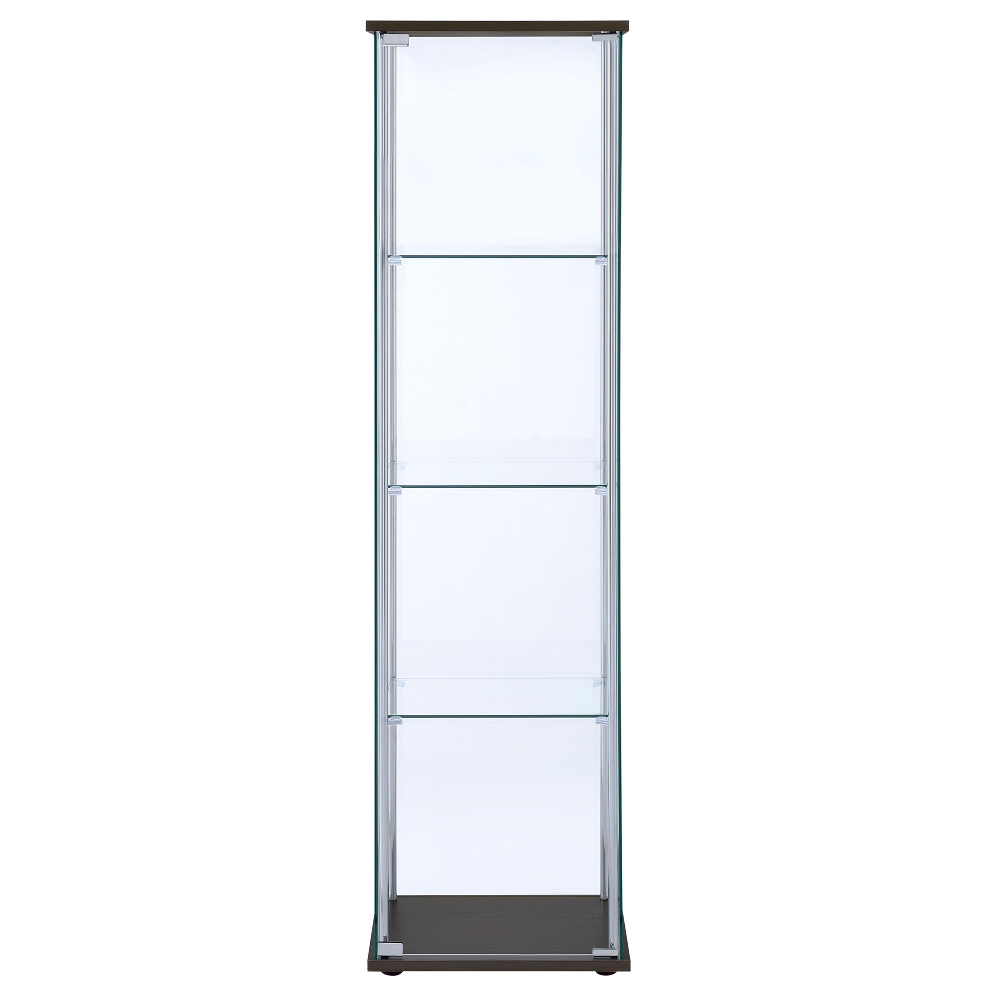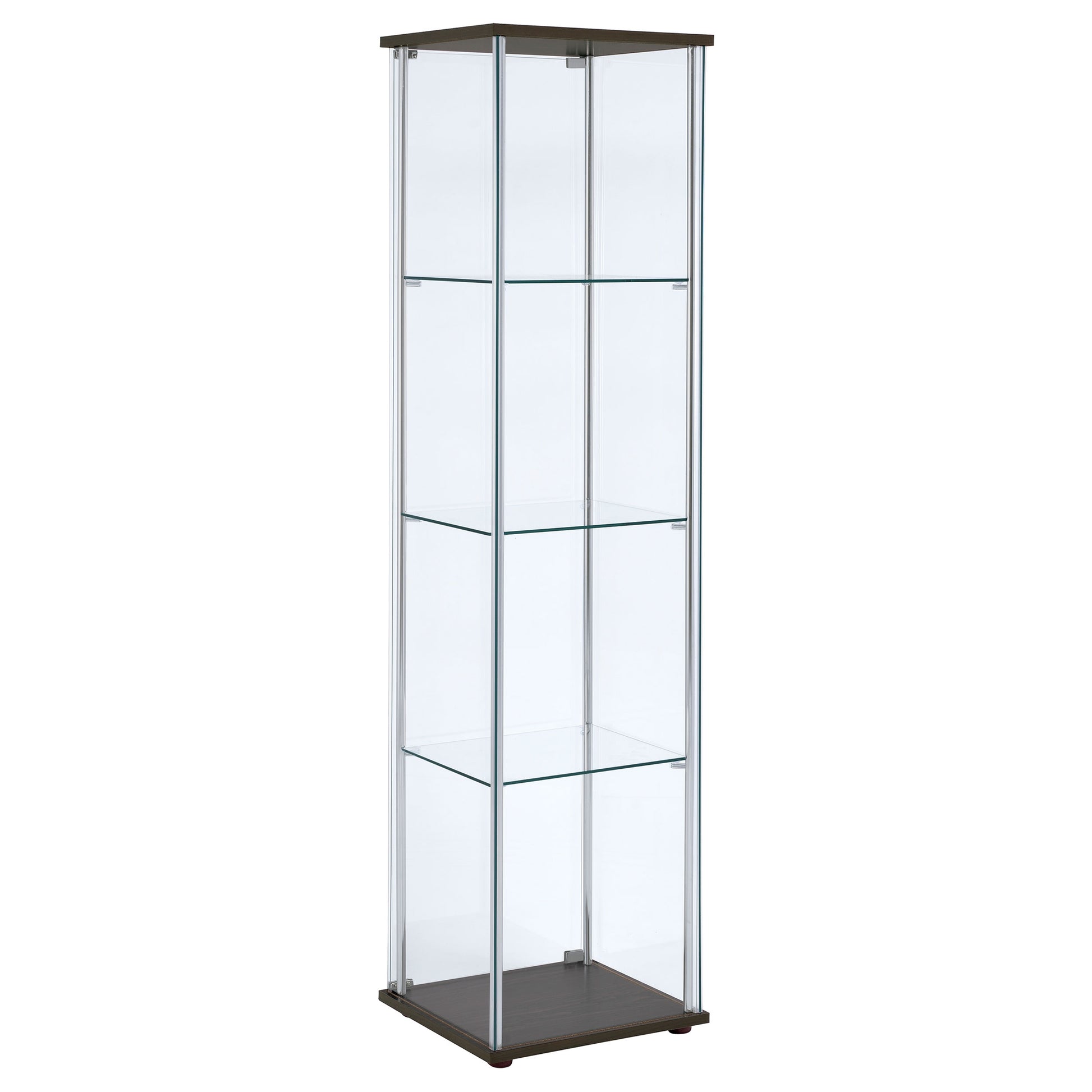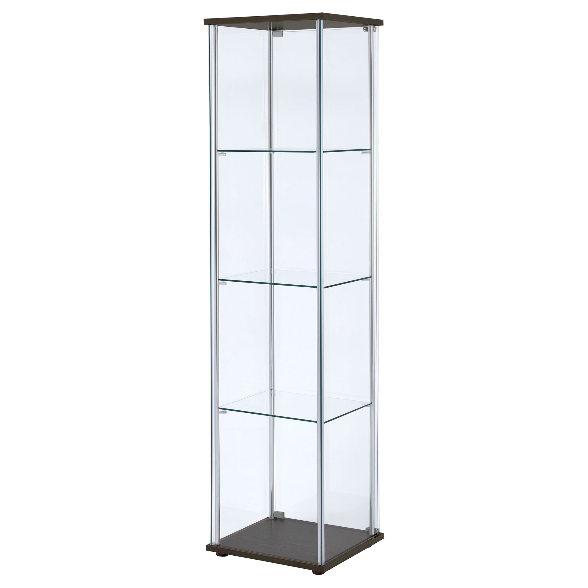 This curio cabinet blends modern simplicity with timeless display function, offering a tall, streamlined silhouette. Clear tempered glass panels and three sturdy shelves create an airy showcase for treasured keepsakes. Chrome tone supports frame the design with contemporary flair, while a rectangular top and base add subtle stability. Crafted with glass, engineered wood, and laminate veneer, this cabinet serves as both storage and statement in living or dining spaces.