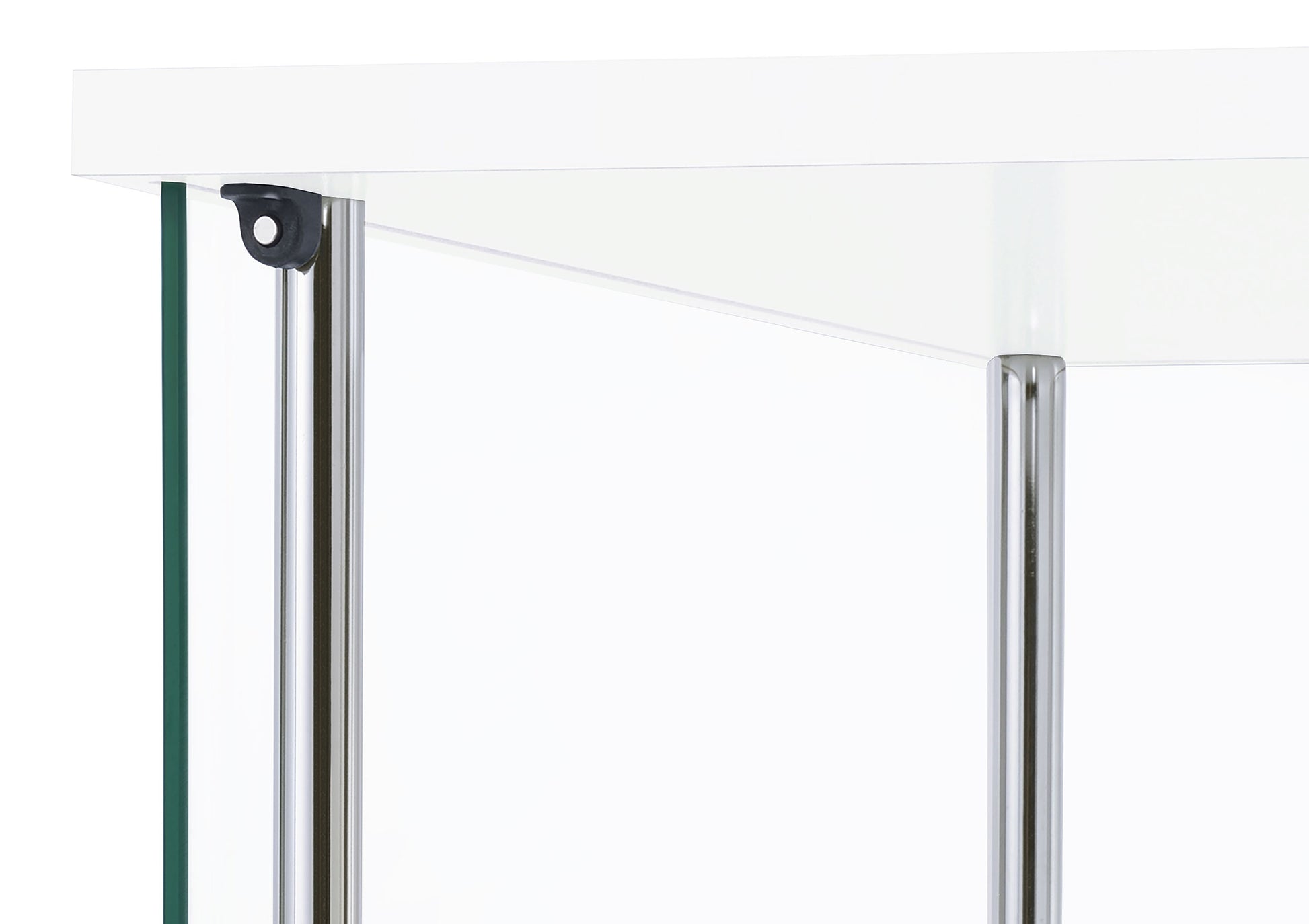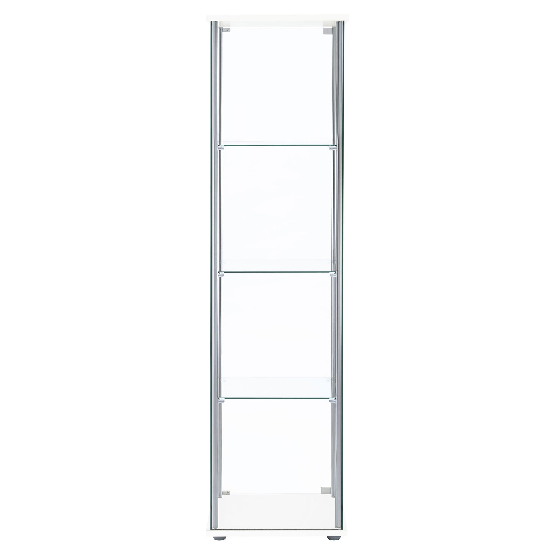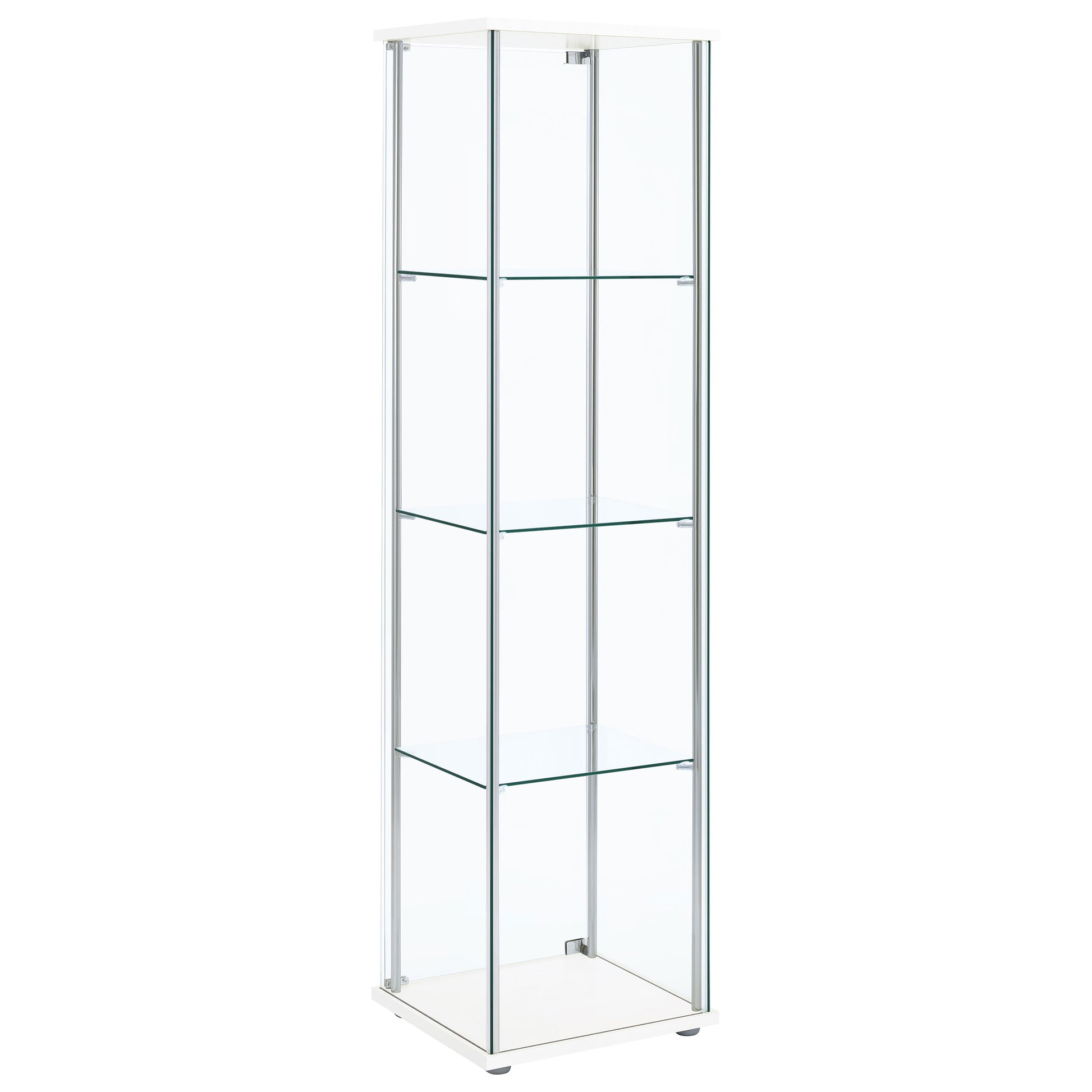 • White finish curio cabinet, rectangular top and base, chrome supports, tempered glass shelving