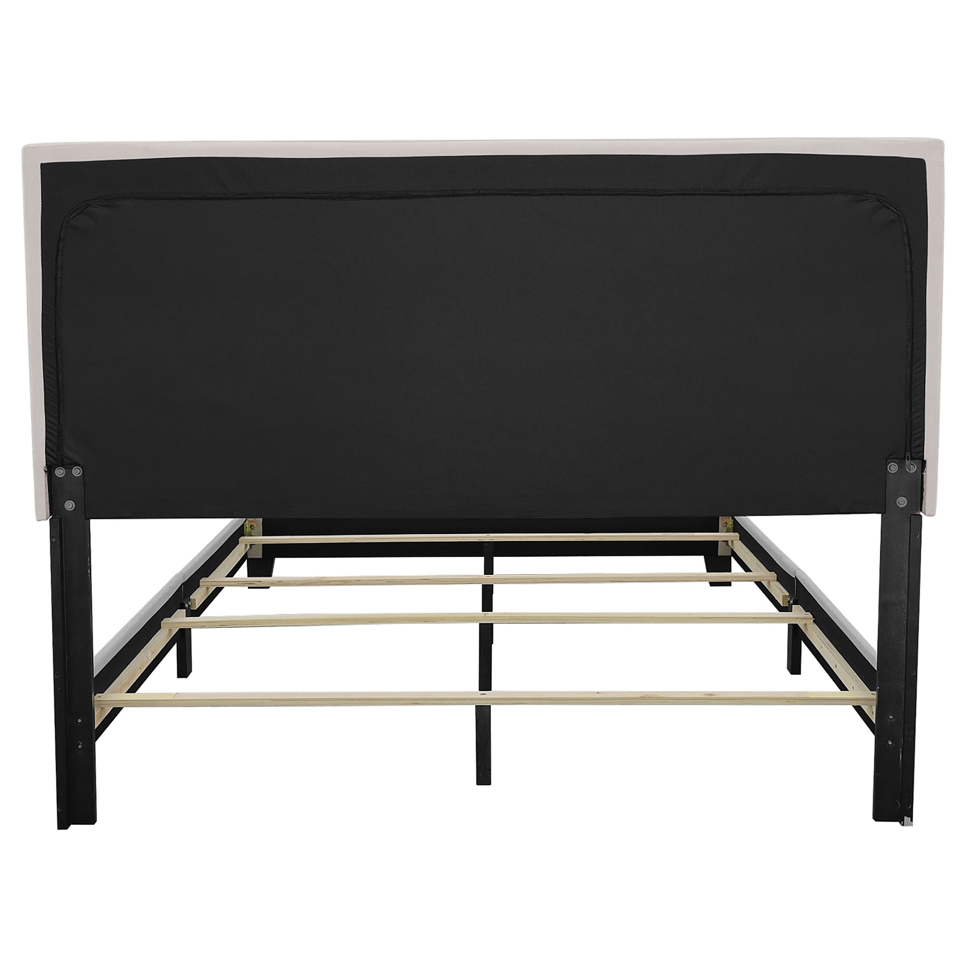 Embrace a relaxed modern style with the smooth edges from this upholstered bed frame. Complete with solid wood legs in black finish, the open frame warms up spaces with simplicity. Chic and individually placed, the chrome nailhead trim adds pops of metallic radiance along the fabric-covered headboard. Constructed of smooth rectangles, the open silhouette feels calm and welcoming. Neutral and soft hues ensure that traditional and contemporary design schemes are maintained.