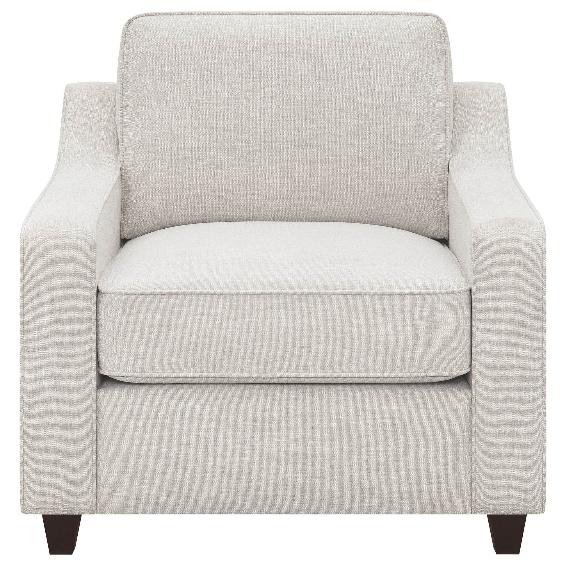 Add understated elegance to your seating area with this upholstered accent chair. Wrapped in soft beige chenille, it brings a light, airy feel that complements any décor. The sloped track arms and dark brown tapered wooden legs create a refined silhouette that balances comfort and sophistication. A boxed seat and back cushion with welt trim highlight its tailored design. Built with a sturdy wooden frame and plush foam cushioning, this chair offers timeless appeal and versatile style for modern or transitional interiors.