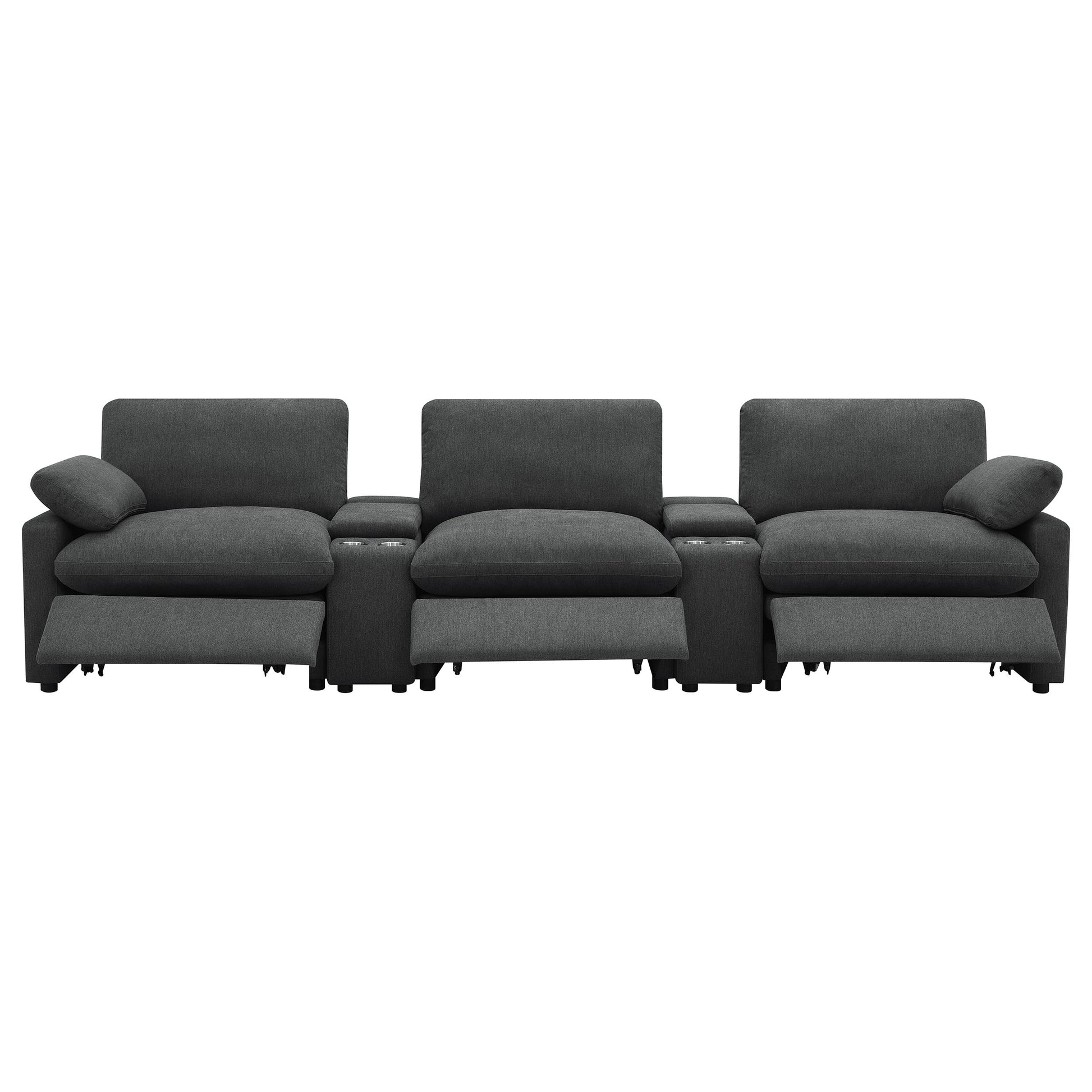 This three-seat home theater seating set combines modern convenience with plush comfort. Each power recliner offers smooth adjustability, while two center consoles feature lift-top storage and dual stainless steel cup holders. Upholstered in soft fabric, the generously padded cushions and pillow-top armrests enhance relaxation. Built for durability and long-lasting support, this seating arrangement is perfect for creating a cozy entertainment space.