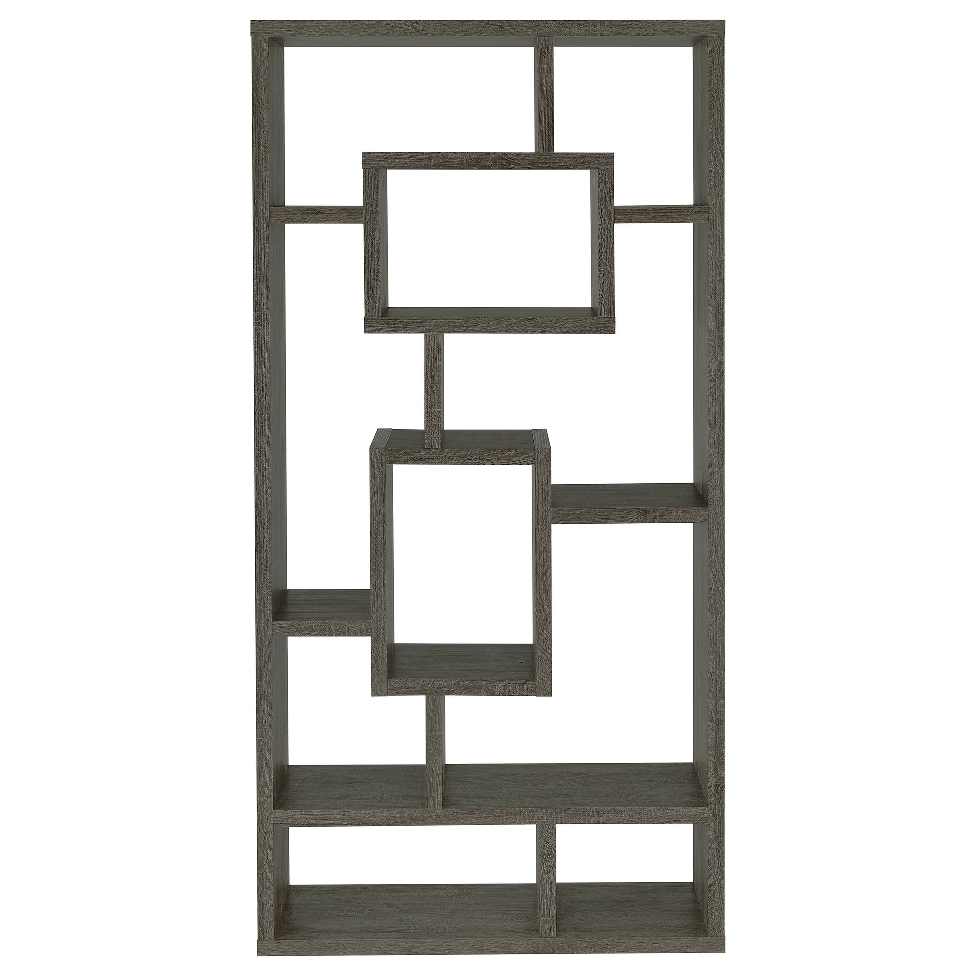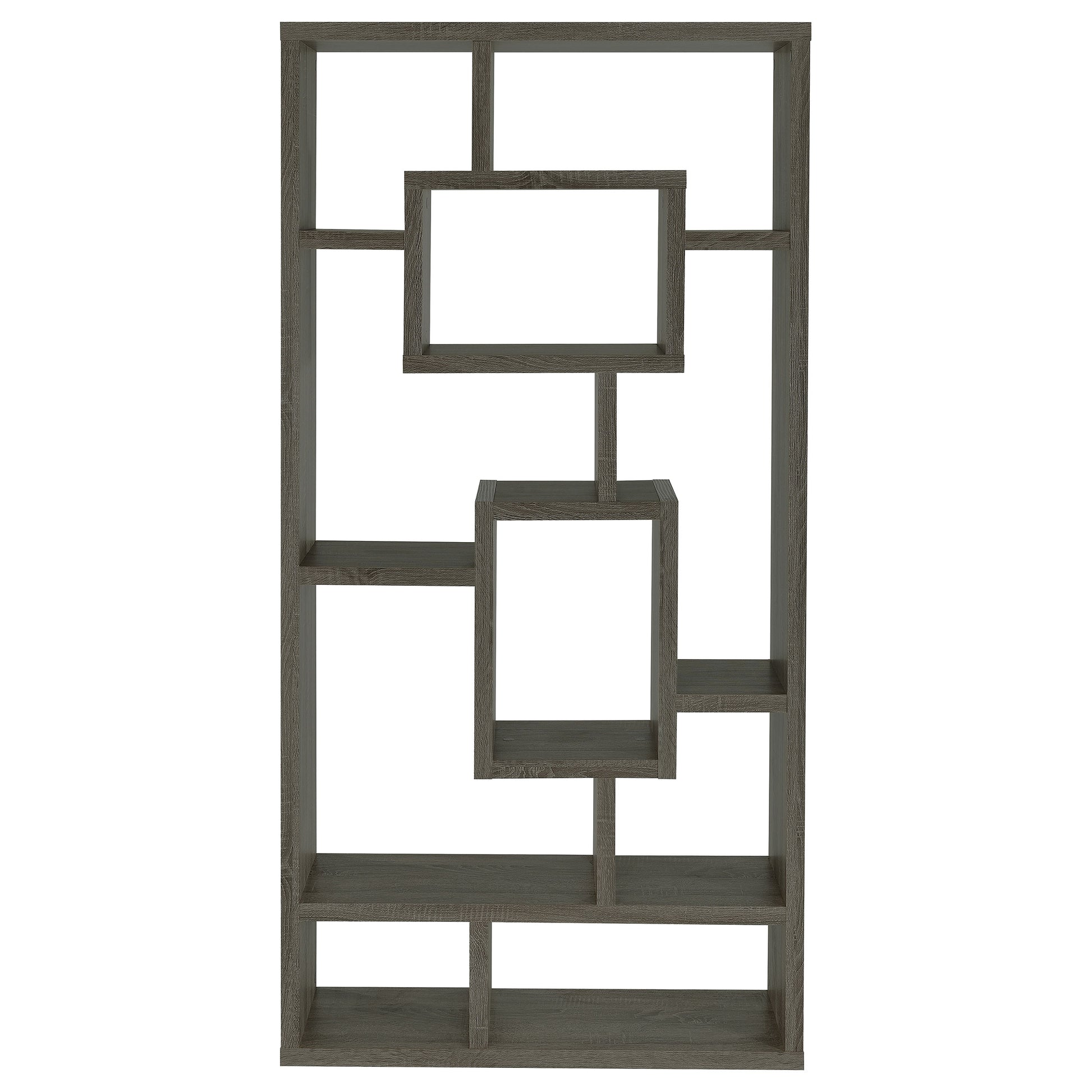 • Weathered grey geometric bookshelf with ten asymmetrical open shelves