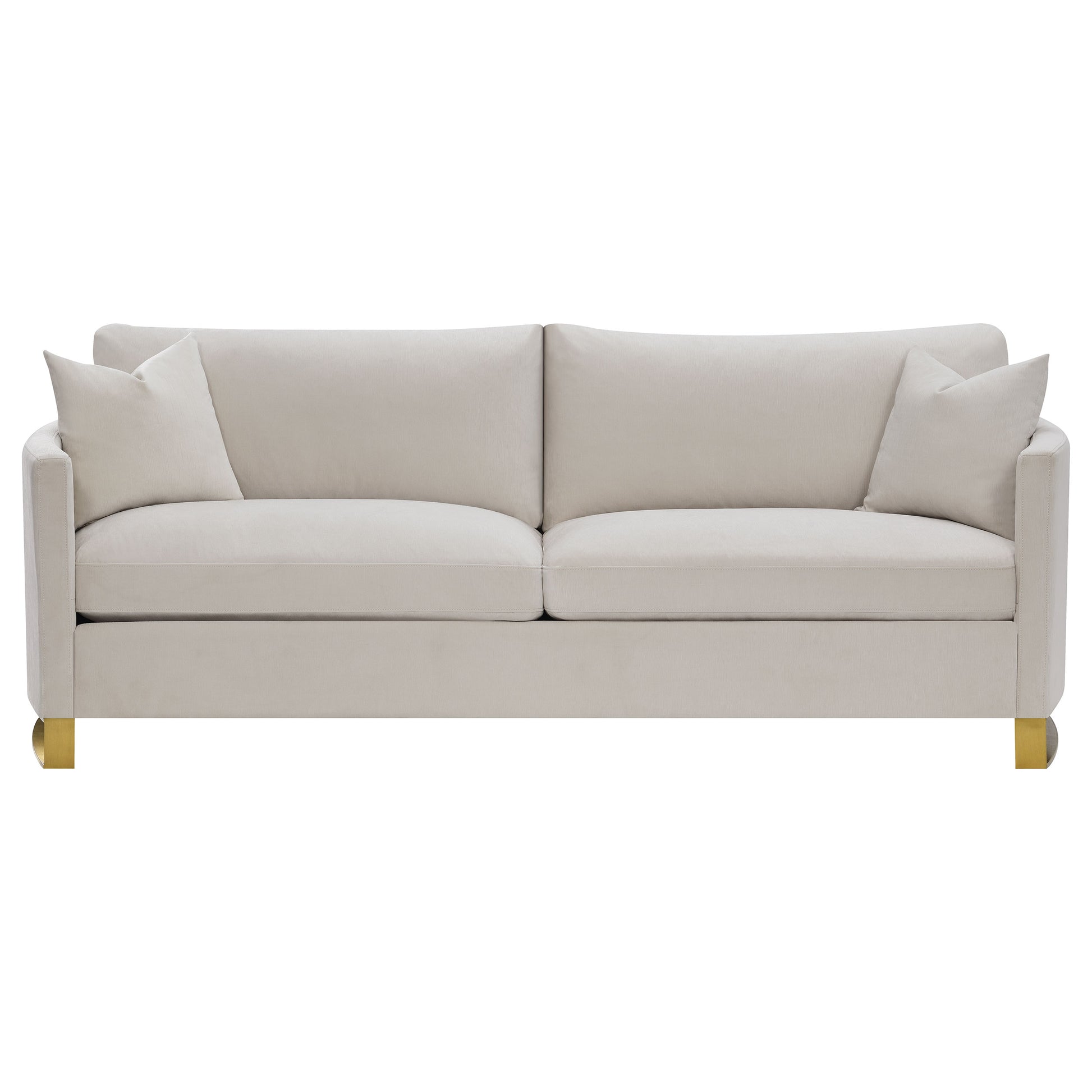 Cool opulence meets magnificent comfort in this plush sofa. It's fashioned with kiln-dried solid pine wood, velvet, and foam with accent pillows for additional style and plush comfort. Reversible feather blend cushioned seat backs offer unsurpassed relaxation after a hard day. Stainless steel legs feature gold accents that make the elegant beige finish even more gorgeous. Enjoy the comforts that this elegant sofa brings to your living room or den.