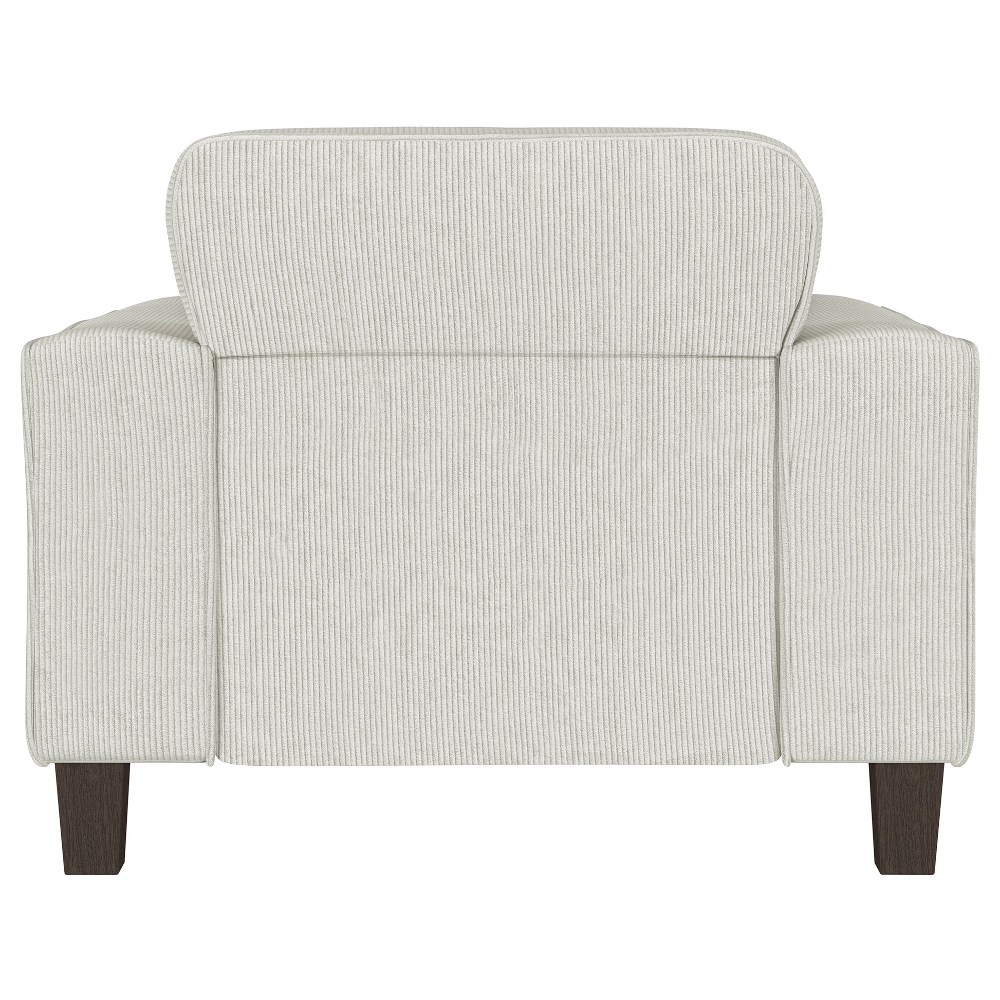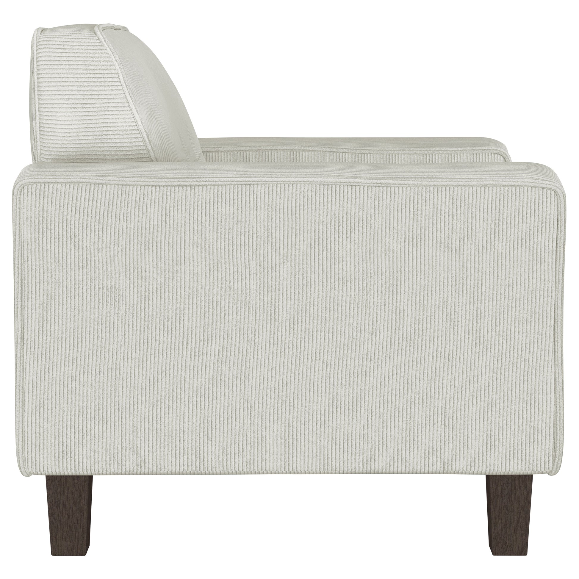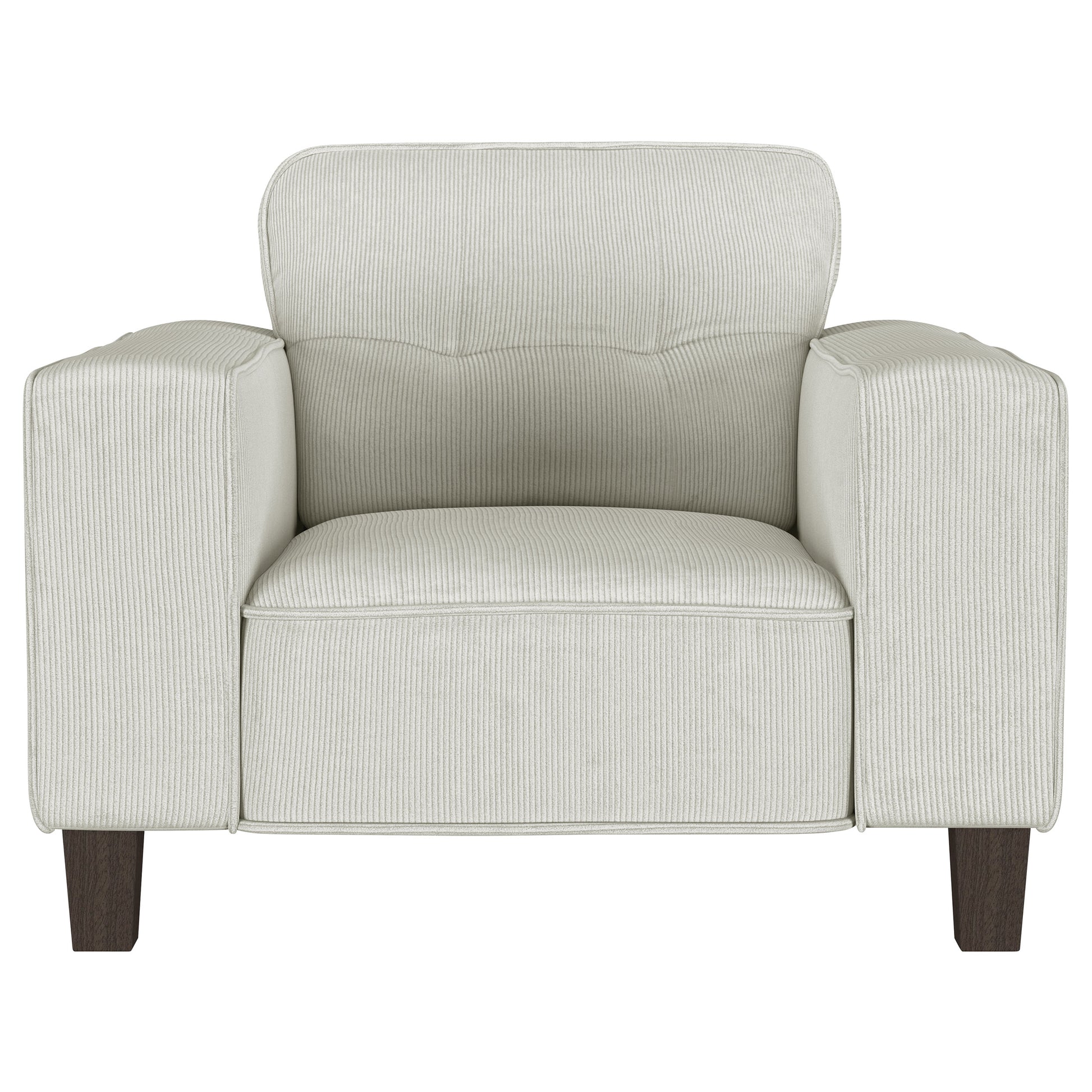 Create a lush, comfortable seating group with a modern accent armchair. Designed for indulgent comfort, it features a solid stance complete with wide track arms and plush cushions. Its soft upholstery is appealingly neutral, complementing in any setting with corduroy like texture that adds chic dimensionality. Back cushions are tufted, with a grid pattern that adds stylish character perfect for a relaxed and inviting living space. The look is complete with tall, tapering wood legs that create a touch of lift for an airy finish.