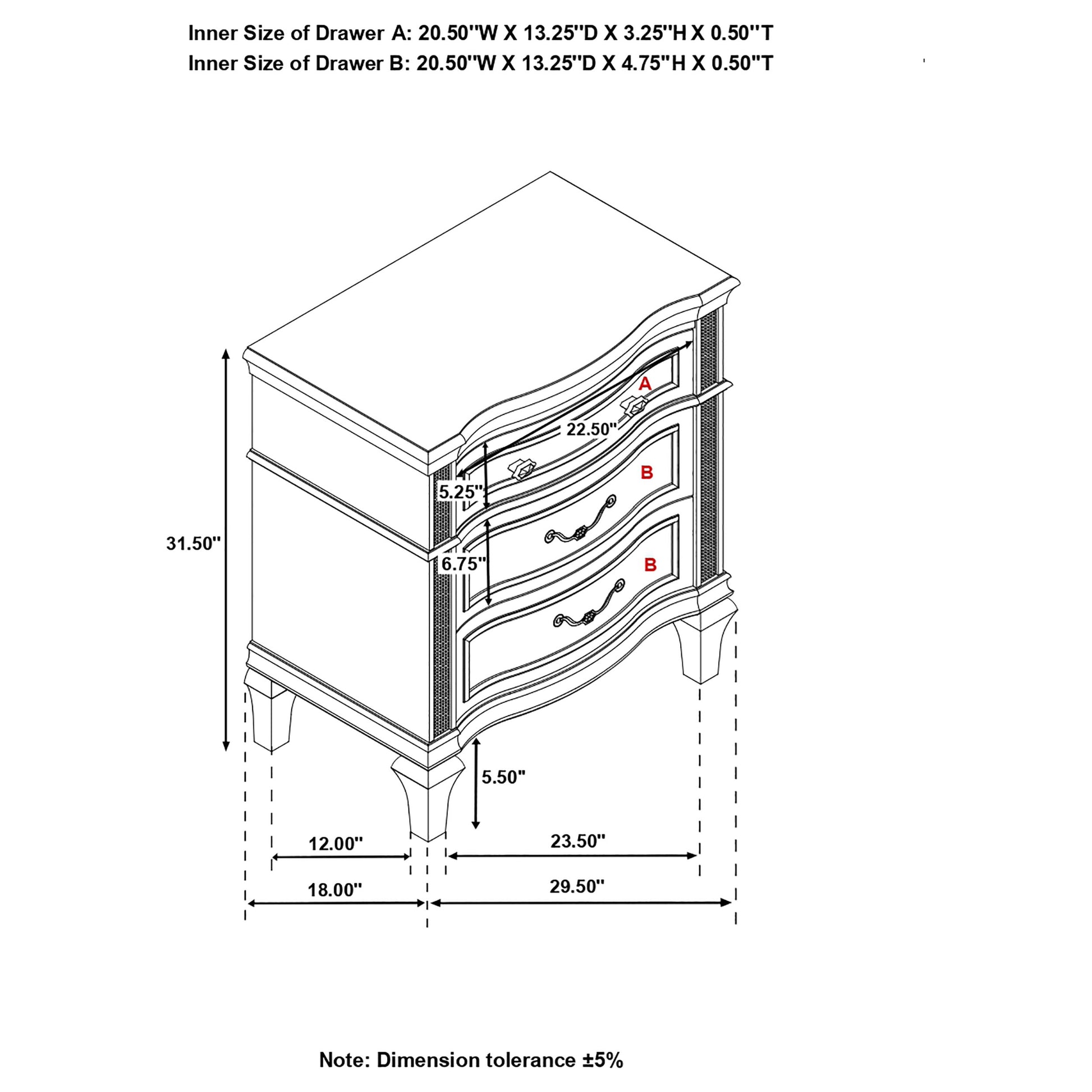 Keep all your bedroom essentials and wardrobe items neatly organized with this glam three-drawer nightstand. A contoured frame design features sparkling side panels flanking the three spacious drawers for a luxurious touch. A silver oak finished wood frame is accented further by modern glam metal knobs and bail handles that help slide each drawer with ease. A soft grey felt-lined top drawer invites you to store more delicate items. A hidden USB outlet creates a convenient charging area for handheld devices.