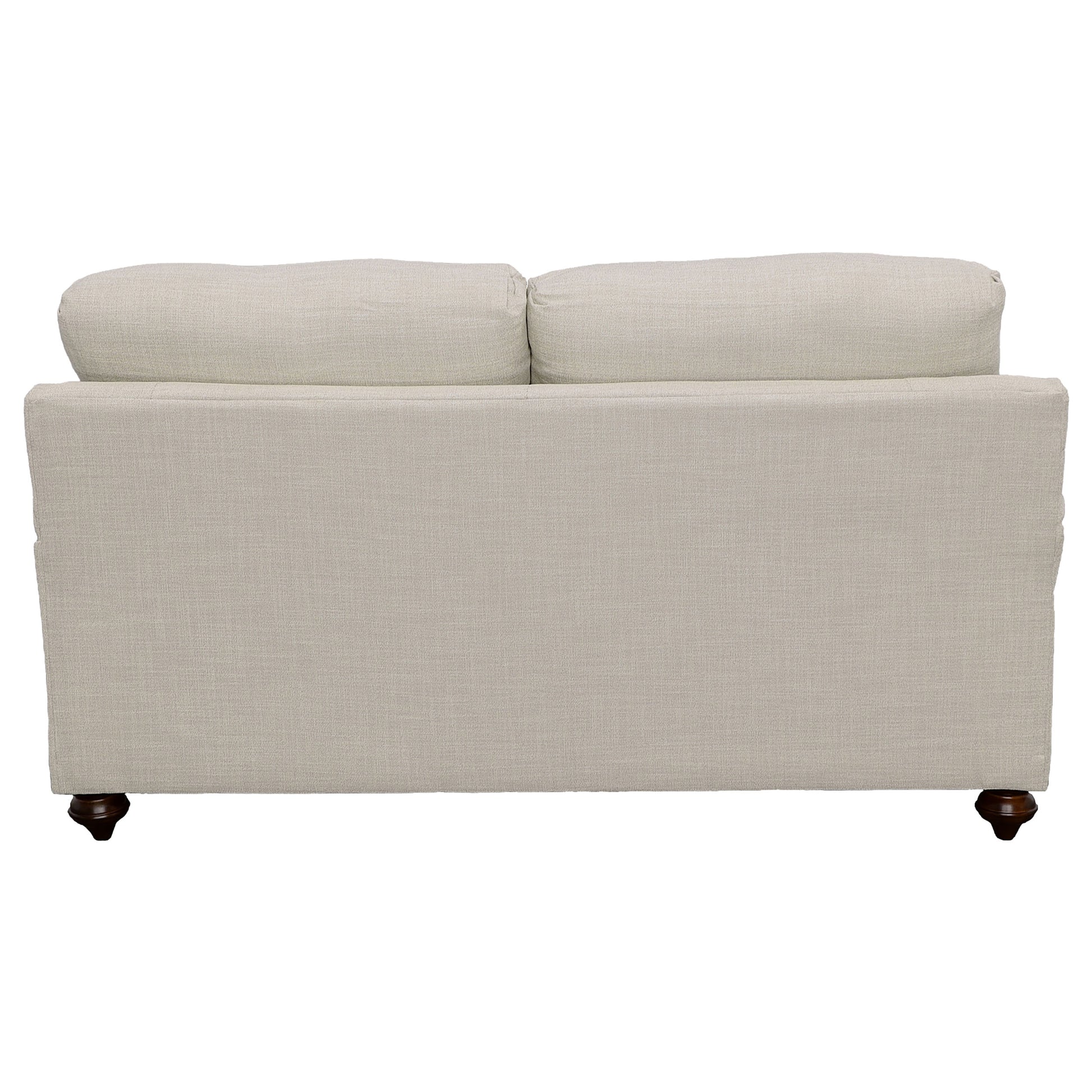 Taking a page from cottage-style farmhouse ambiance, this two-piece sofa and loveseat set wins over family and guests with its elegant simplicity. With tailored English arms and turned legs offering a contrasting espresso finish, each piece of this set shines with a light grey linen-like upholstered cover. Reversible cushions with T-cushions on each end create comfort and stay in shape, as a solid wood frame with a sinuous spring deck sets the stage for durability. Attached back cushions remain stationary to prevent shifting. Enjoy the designer look of seven accent pillows with varying blue print covers.