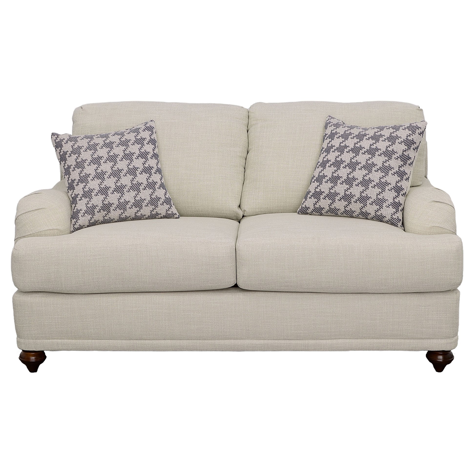 Charming style dominates the design aesthetic of this three-piece sofa, loveseat, and chair set. With tailored English arms and turned legs offering a contrasting espresso finish, each piece of this set comes wrapped in a linen-like upholstered cover. Light grey upholstery stands out in the sofa and loveseat, accented with a whimsical blue and grey houndstooth check covering the accent chair. Reversible cushions with T-cushions on each end of the sofa and loveseat create comfort and stay in shape, as a solid wood frame with a sinuous spring deck sets the stage for durability and attached back cushions prevent shifting. Enjoy the designer look of Seven accent pillows with varying blue patterned covers.
