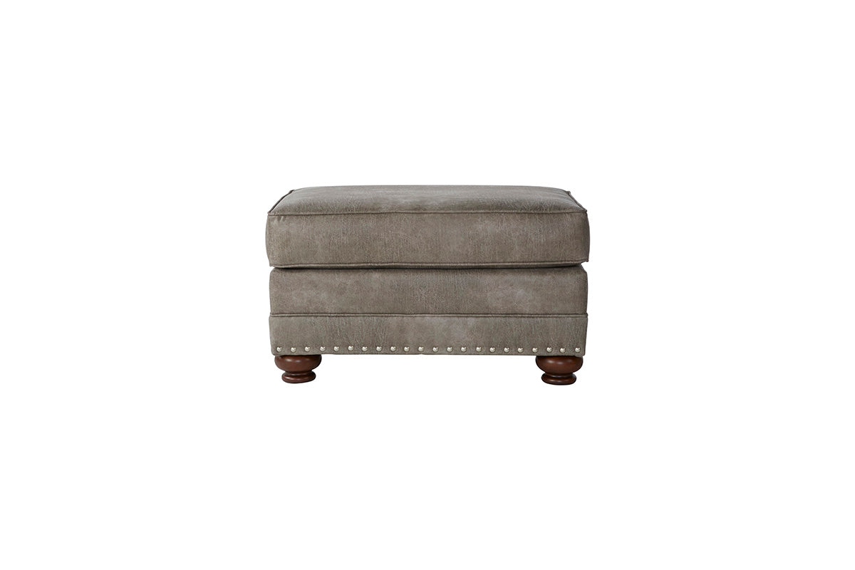 Transform your living space with the rugged sophistication of the Goliath Mica Ottoman. Embrace the charm of traditional lodge style infused with a modern twist in its luxurious leather-look fabric adorned with pewter nailheads. Sink into comfort with top-stitched back cushions that invite you to relax in style. Elevate your home décor effortlessly with this timeless piece that exudes elegance and durability.