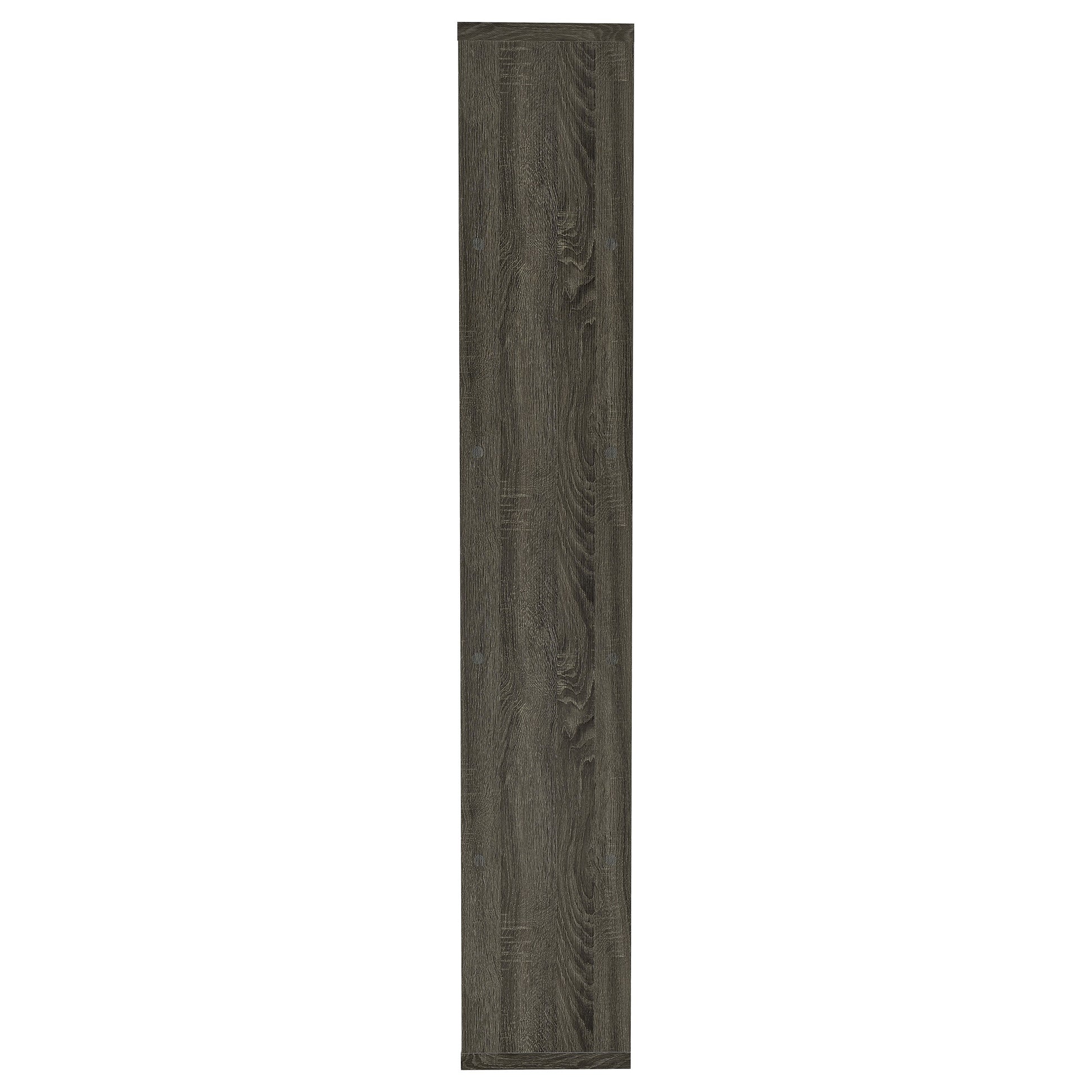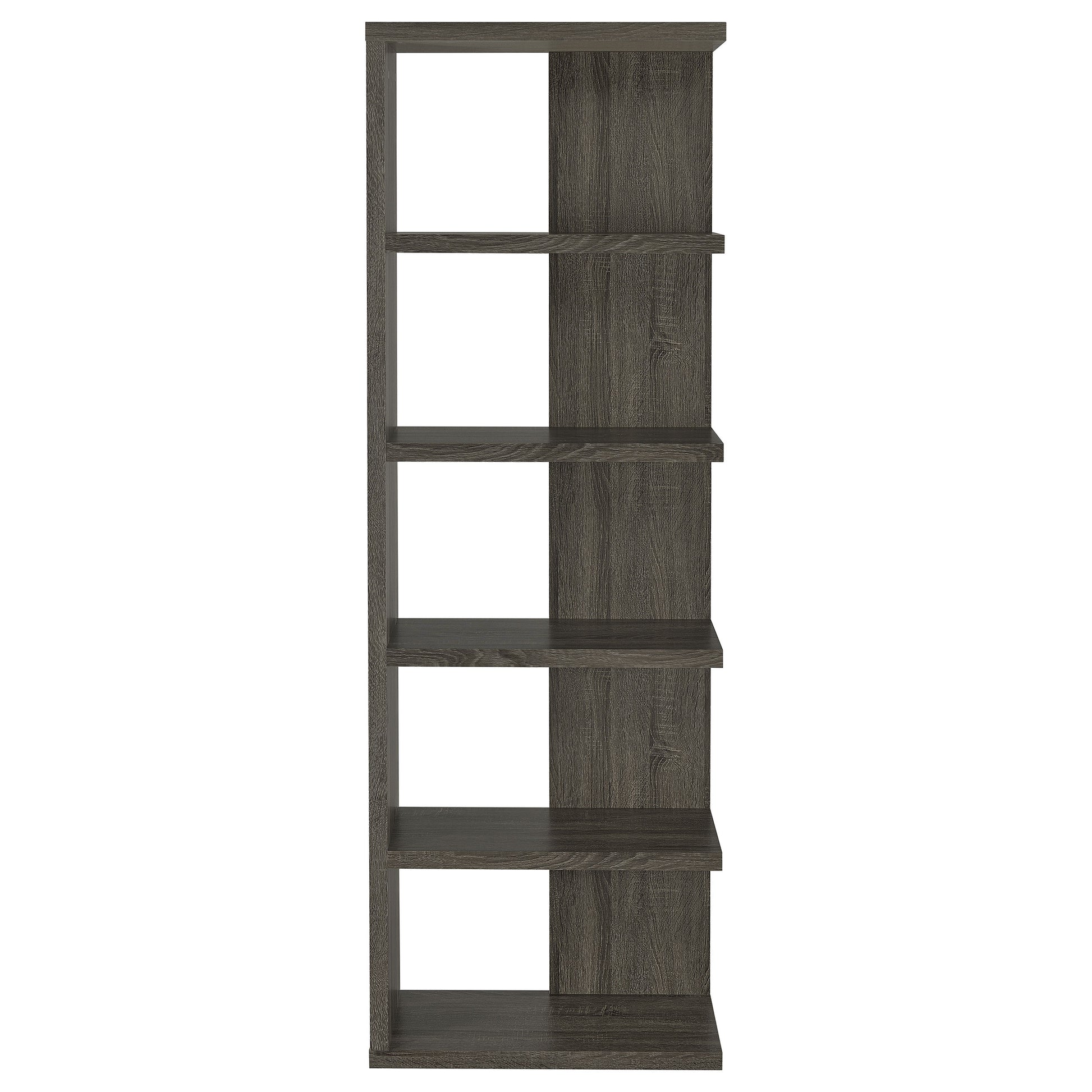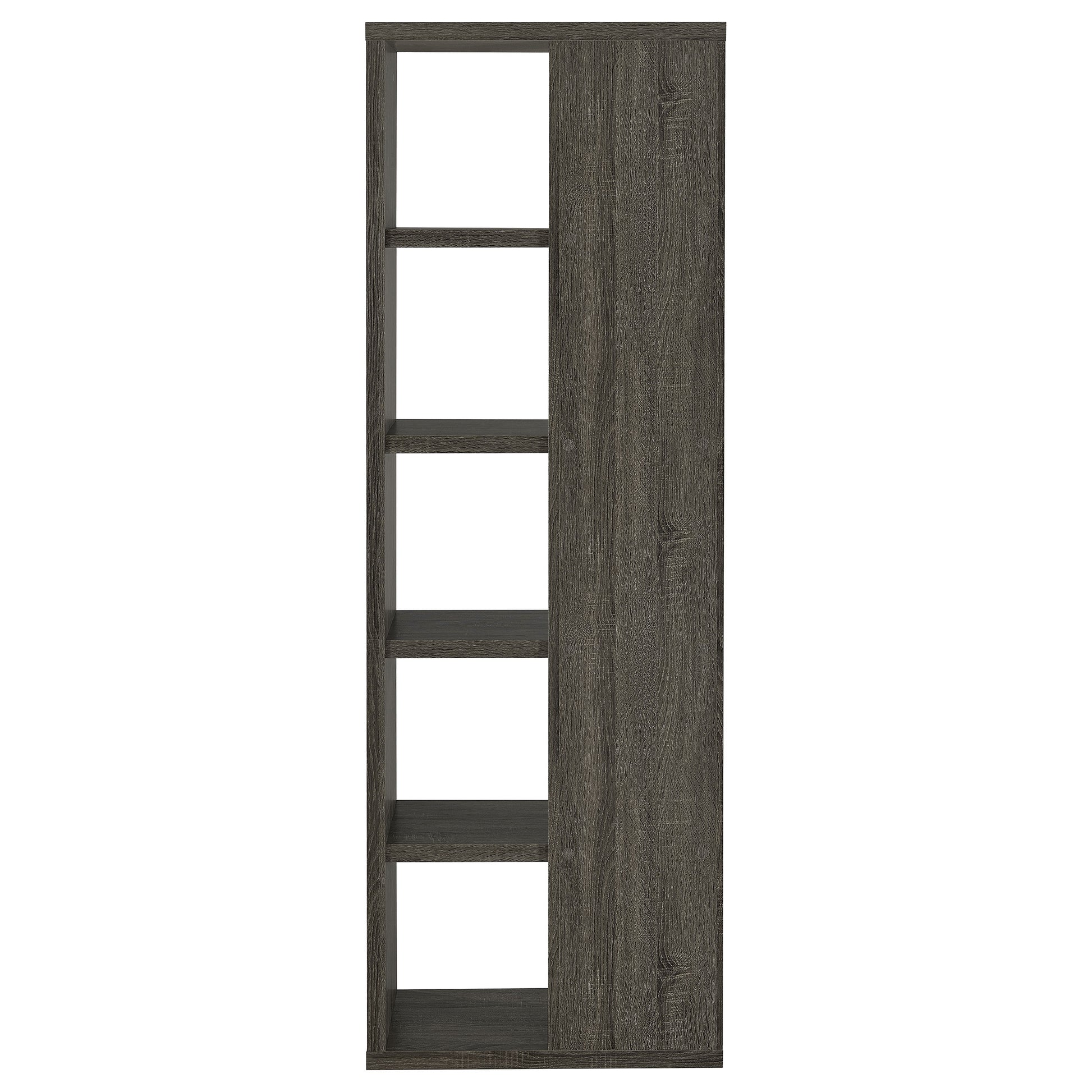 Add a touch of modern charm to any room with this stylish bookshelf in a weathered grey finish. Designed with a mix of open and backed shelving, it brings visual intrigue and versatility to your storage needs. Crafted from engineered wood and finished in eco-friendly melamine veneer, this unit offers five spacious tiers perfect for books, décor, and keepsakes in a contemporary home office or living space.