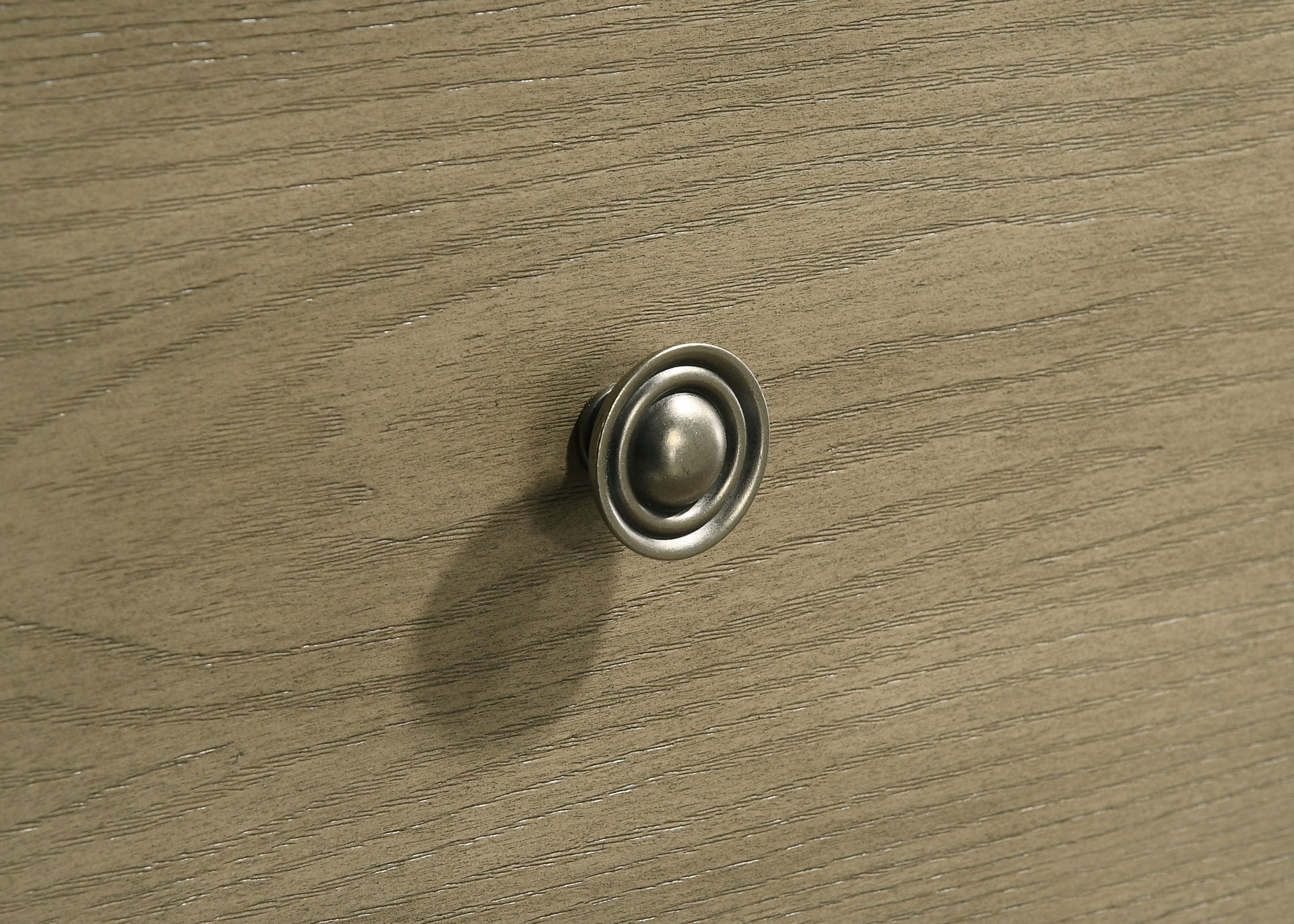• Case pieces feature antique nickel metal knob and pull handles for a subtle metallic accent
