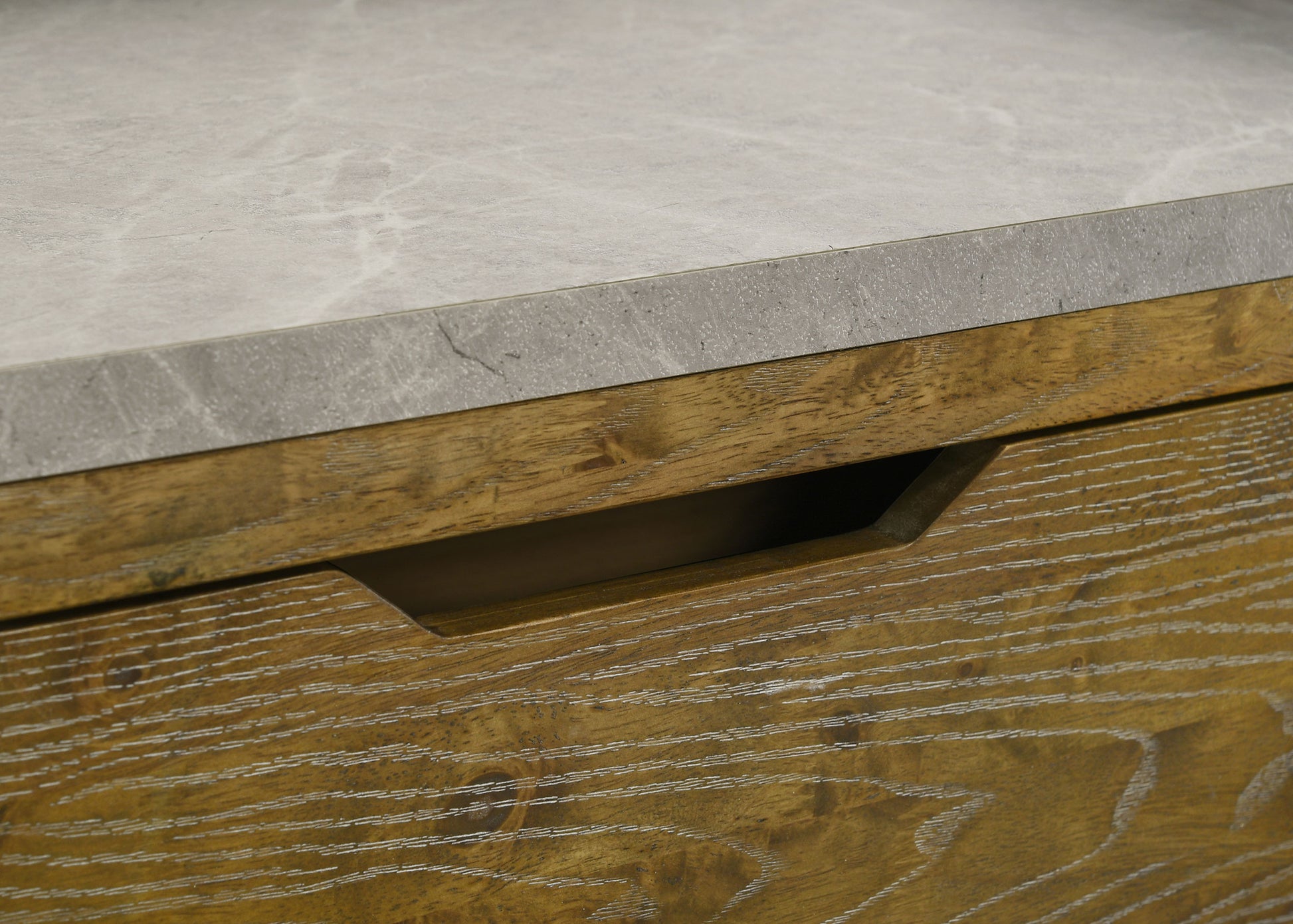 • Faux marble melamine tops on case pieces add sleek contrast and visual depth