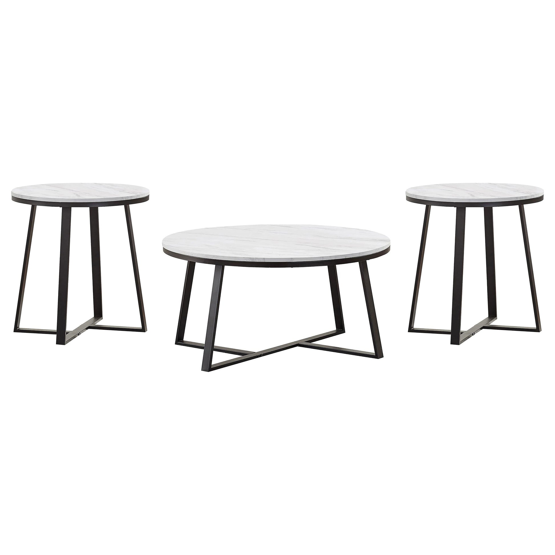 This coffee table set offers a stylish two-tone design that enhances modern living rooms with ease. Featuring round tabletops crafted from white faux marble and subtle grey veining, these tables exude elegance. The intersecting U-shaped legs in matte black powder-coated metal form a striking geometric silhouette. Constructed with engineered wood, PVC laminate, and heavy-gauge metal, the set ensures both durability and contemporary appeal. Ideal as a cohesive centerpiece for any living space.