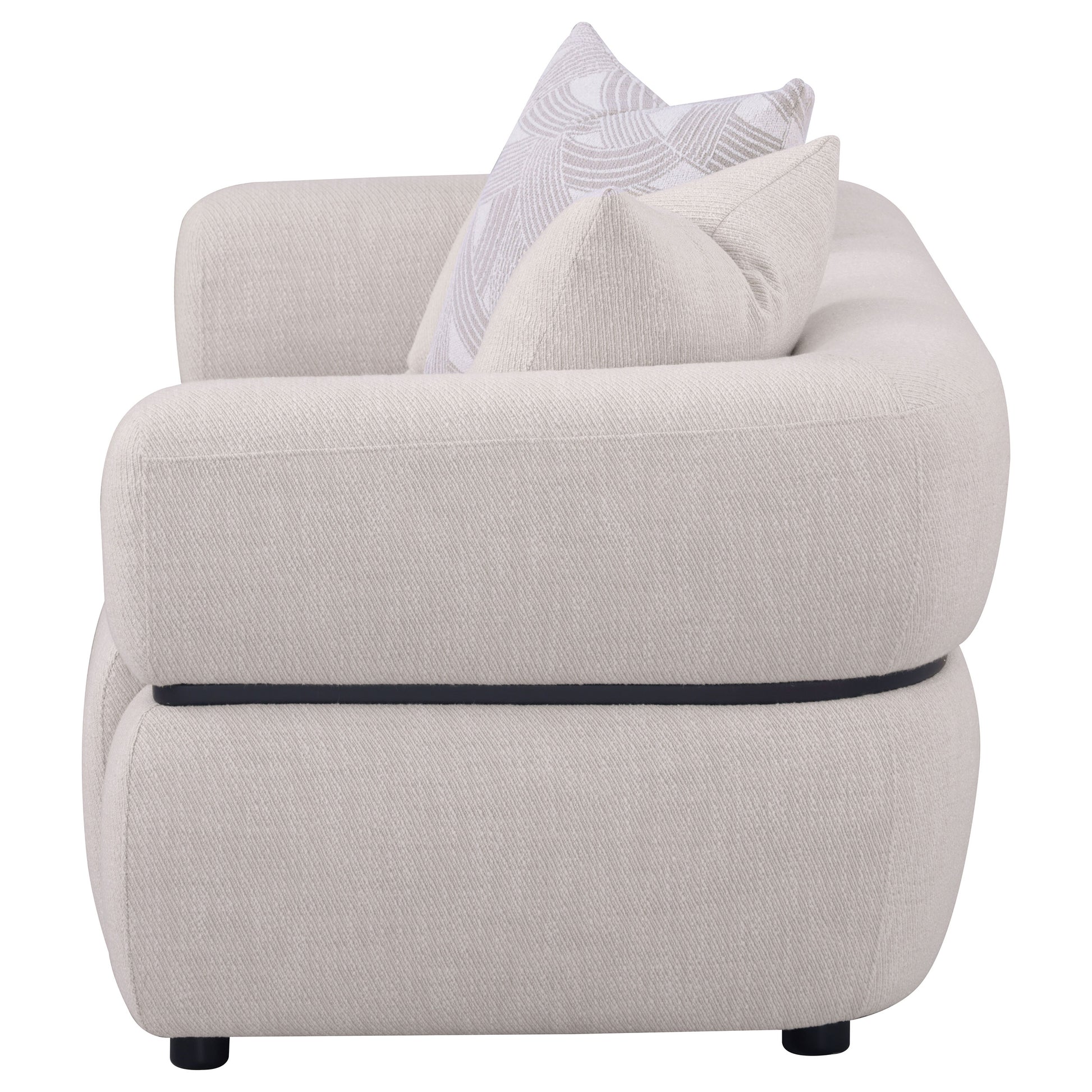 With a striking silhouette and artistic presence, this sculptural loveseat pairs bold form with inviting comfort. A distinctive solid wood waistband traces the frame, emphasizing its contemporary curve. Textured beige upholstery wraps the waterfall bench seat in a tailored embrace, punctuated by plush down and feather blend accent pillows. Constructed with pocket coil support for durability, this loveseat becomes an eclectic focal point in modern living spaces.