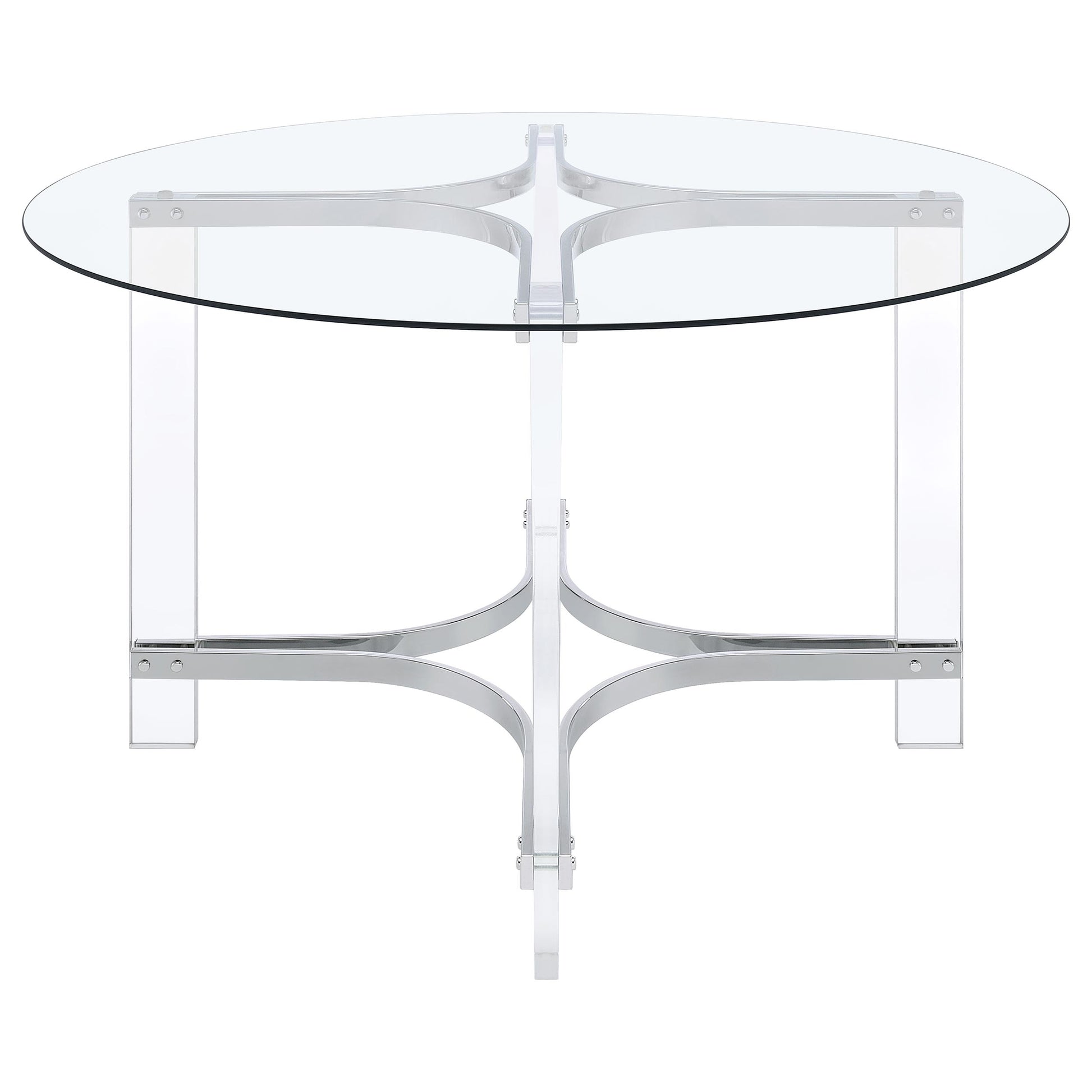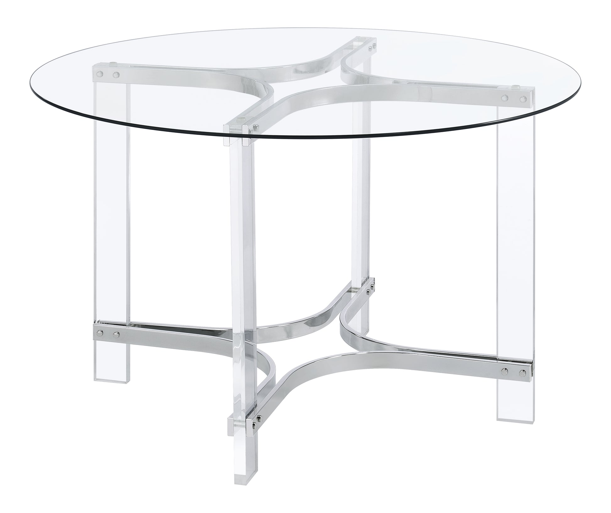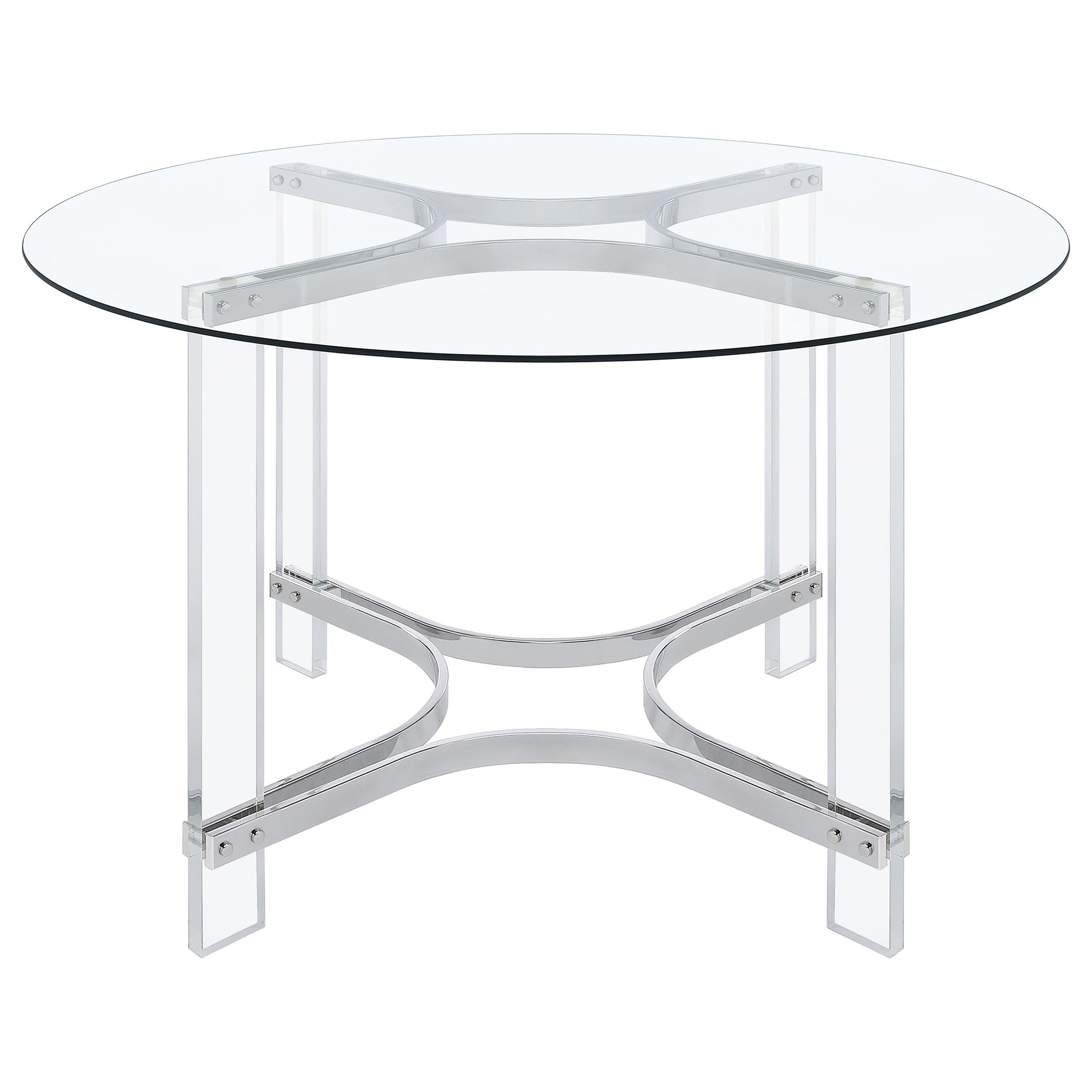 Elevate your dining experience with this chic, contemporary dining set, where modern design meets airy elegance. This set includes a stunning round glass-top table with clear acrylic legs that create a sleek, sculptural profile, complemented by gleaming chrome accents for a touch of sophistication. Four side chairs with clear acrylic seats and backs complete the set, adding a minimalist yet comfortable touch to your space. The sled-inspired chrome bases of the chairs provide stability and a dynamic contrast to the graceful curves of the acrylic, making this set an eye-catching centerpiece for any modern dining room or breakfast nook. Perfectly suited for compact spaces, this set combines style and functionality, offering a light and open feel that effortlessly enhances any decor.
