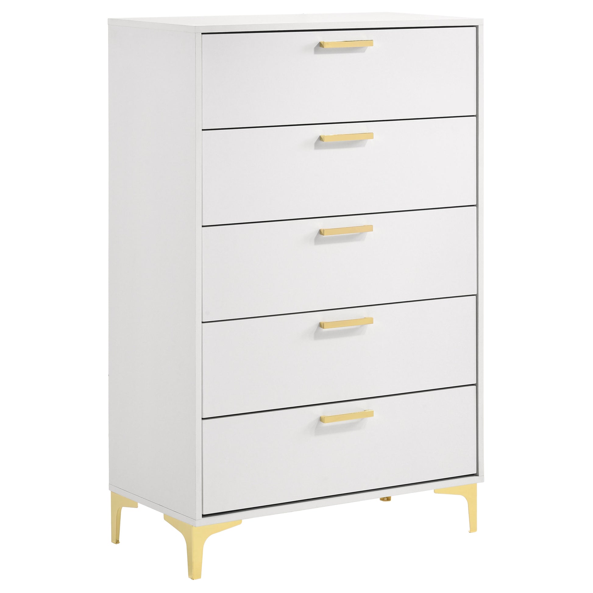 Open up your tight bedroom floor plan with this stately modern glam chest. Five spacious drawers stacked on top of one another keep garments and bedroom essentials stowed away and organized, helping you find what you need fast. A bright, white finish offers a sleek elegance, set off by warm golden accents. Along each of the five drawers is a slender gold finished pull, matched by the golden bracket legs that lift it up. Place this stunning five-drawer chest in your bedroom for an elegantly understated contemporary aesthetic.