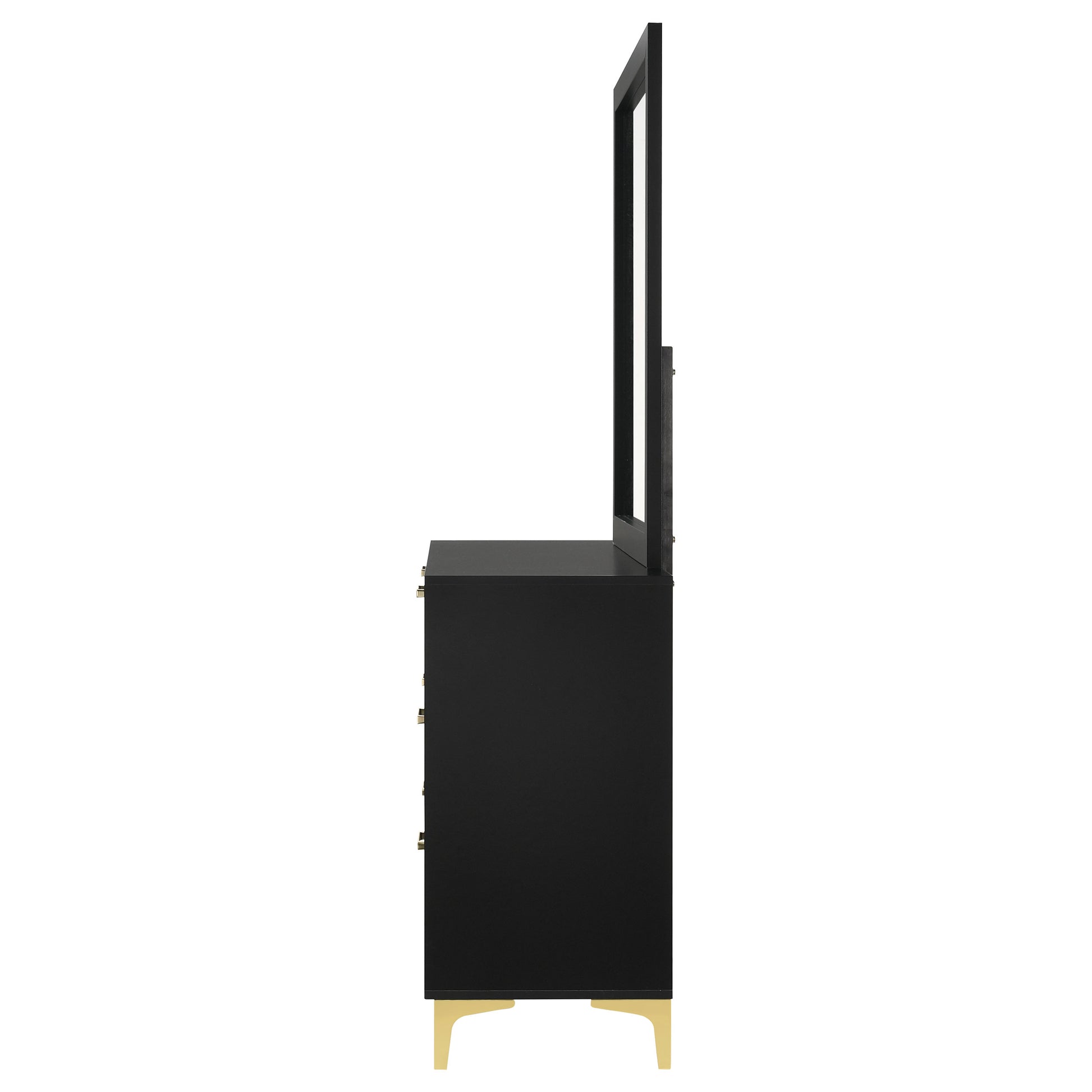 Elegance meets functionality in the 224453M Dresser and Mirror set, with its modern glam design that maximizes your space while offering ample storage. The sleek dresser's boxy black frame and six spacious drawers provide a bold and organized focal point in your bedroom. Each drawer, accented with slender gold pull handles, contrasts beautifully with the black finish, while the gold bracket legs echo the metallic theme. The accompanying mirror's tall, clean-lined frame enhances the setup, creating an ideal vanity space that blends seamlessly with any color palette. This set is not just a statement piece; it's a testament to sophisticated design that serves everyday needs with style.