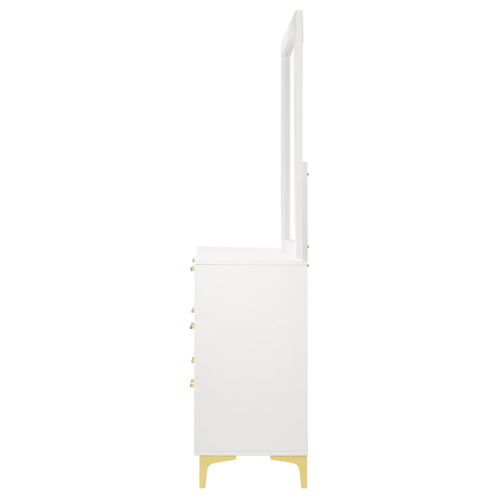 Brighten up your bedroom with the modern glam and cheer of this six-drawer dresser, a statement piece that brings a light and airy feel to contemporary spaces. Gold-finished pulls and bracket-style legs infuse the piece with a touch of luxury, while the crisp white finish keeps it sleek and dignified. Ideal for anchoring your focal wall or complementing a vanity area, this long and narrow dresser is a splendid addition. The accompanying contemporary mirror, framed in white, adds height and elegance, creating a formal vanity when placed atop the dresser.