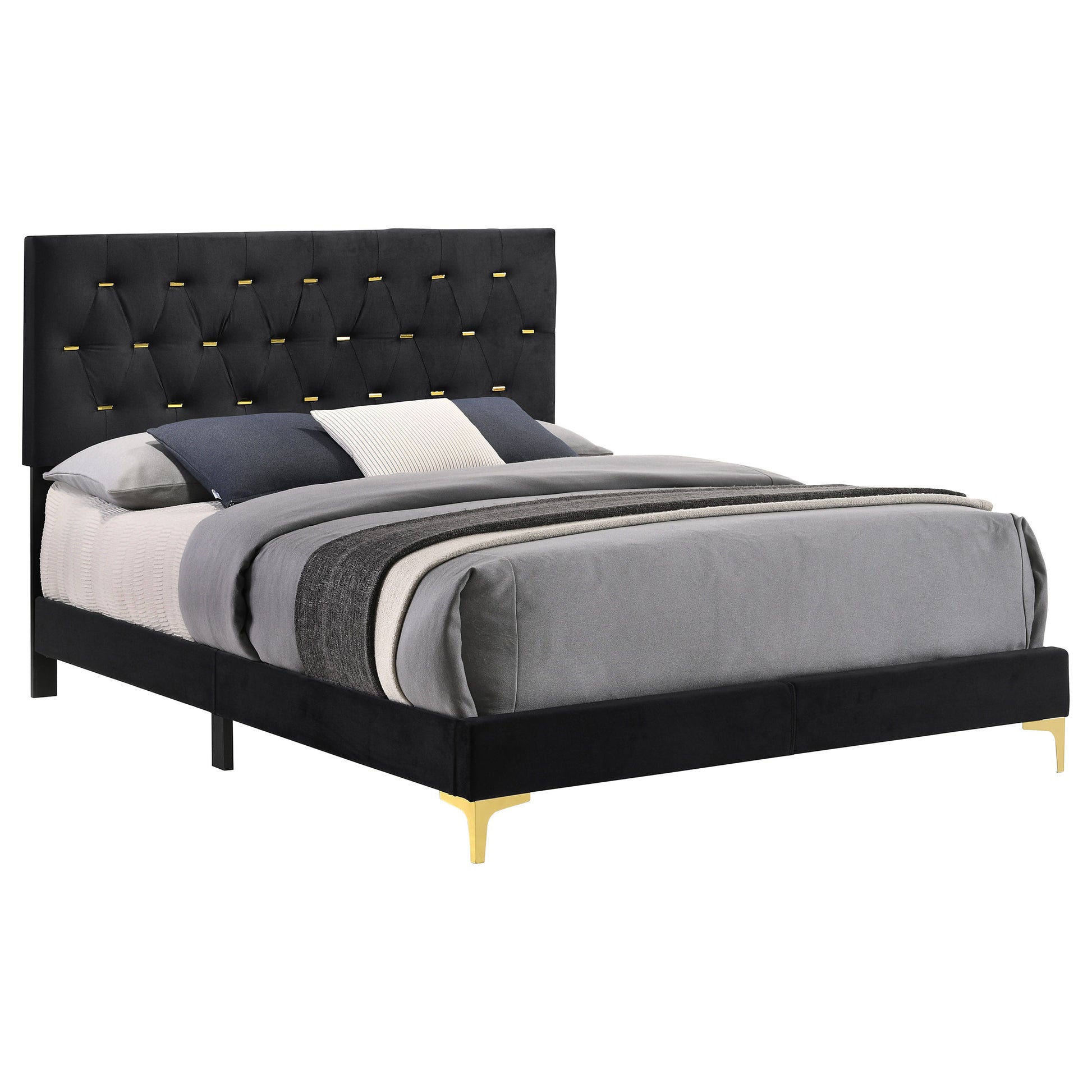 Transform your bedroom oasis into a dramatic interior with this modern glam panel bed. Upholstered in plush, black velvet throughout the foam padded headboard and sides, this stunning bed offers a glamorous expression to your space. A diamond tufted headboard accented with gleaming gold bars in place of buttons creates a new, contemporary touch that catches the eye. Matching gold metal bracket legs create a luxe industrial flair too. Place this modern bed in a bedroom for a chic and sophisticated look.