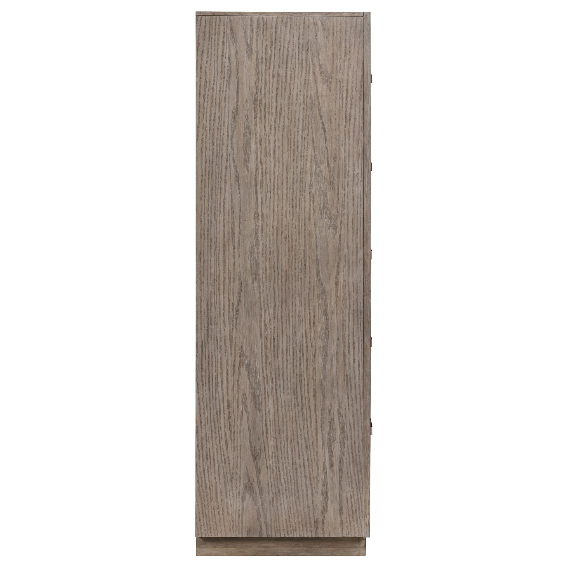 Chrome finish bar pulls add a touch of shine to the neutral barley brown finish of a modern five-drawer chest. Delivering ample storage with a compact footprint, the chest features a streamlined silhouette with mitered trim that creates a sense of depth. The top provides an easy spot for decor or a jewelry box that brings a personal touch. The soft wood grain finish of the chest complements in a variety of bedroom settings, making this a versatile choice for your home. The look is complete with a recessed base that provides a touch of height and airy presence.