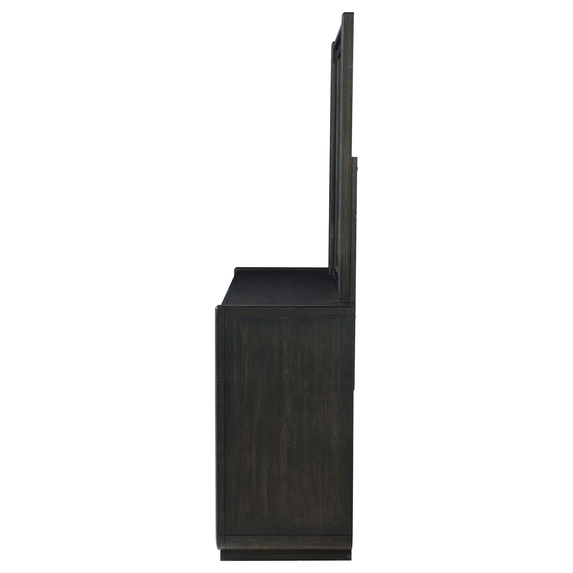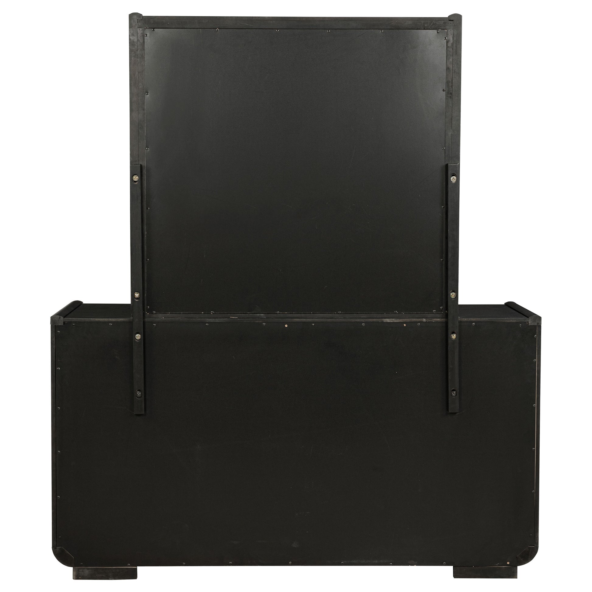Grounded in grace and softened by design, this eight-drawer dresser and mirror set brings balance to the bedroom with understated elegance. Cloaked in a burnished black finish, the frame curves subtly at the edges for a sculptural feel. Spacious drawers open with quiet ease thanks to soft-closing glides, while black felt lining in the top drawers offers protection for delicate essentials. Above, a minimalist mirror completes the silhouette, reflecting form and light in quiet harmony.