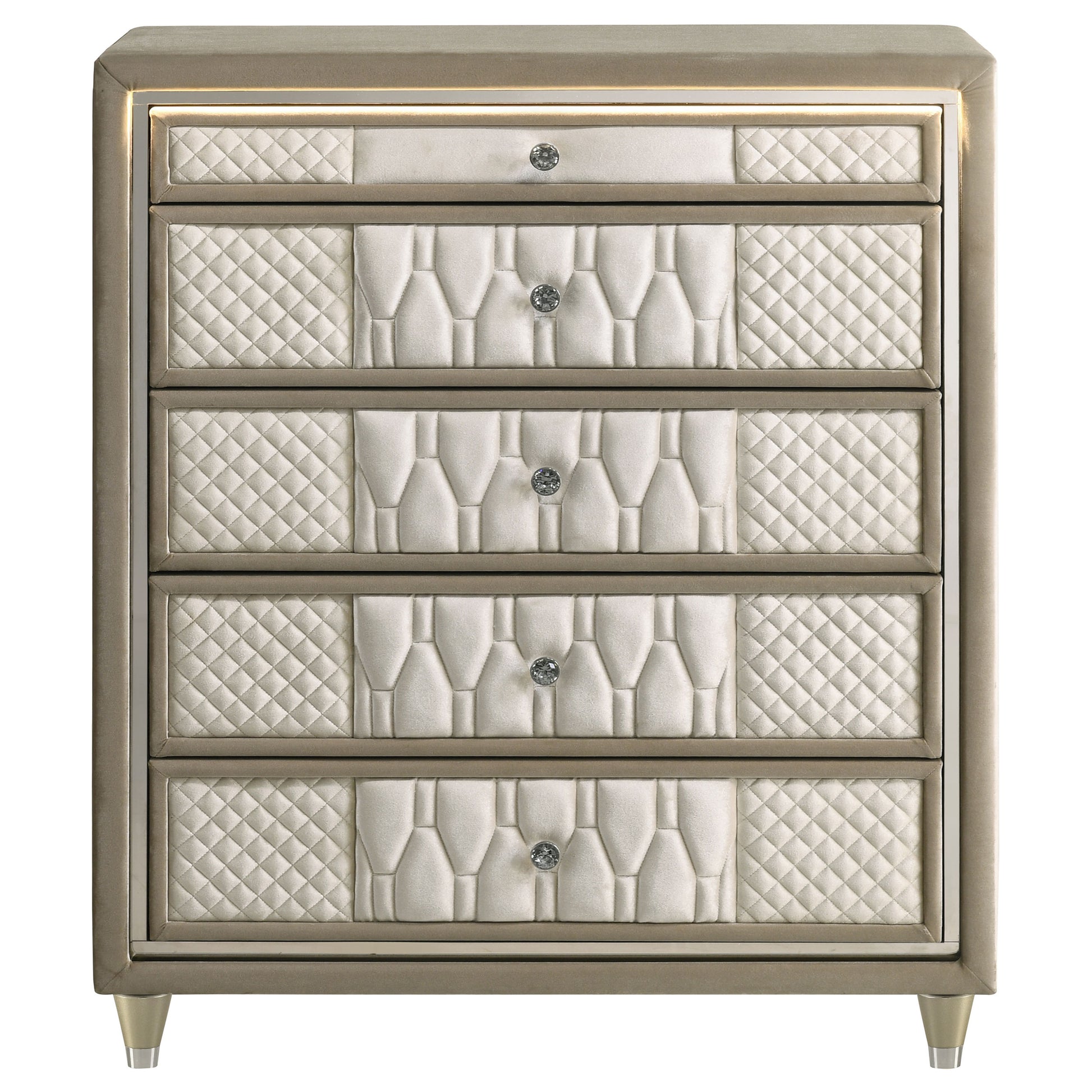 Embrace elegance in full velvet with this five-drawer chest, where ambient lighting meets refined craftsmanship. Upholstered in a harmonious mix of ivory and camel velvet, each drawer is adorned with quilted textures, reflective acrylic accents, and crystal knobs for a soft yet glamorous presence. Integrated LED lighting casts a warm glow, while the brown felt-lined top drawer, English dovetails, tempered glass top, and heavy-duty glides elevate everyday function. Supported by solid rubberwood legs, this chest blends softness with luminous charm.