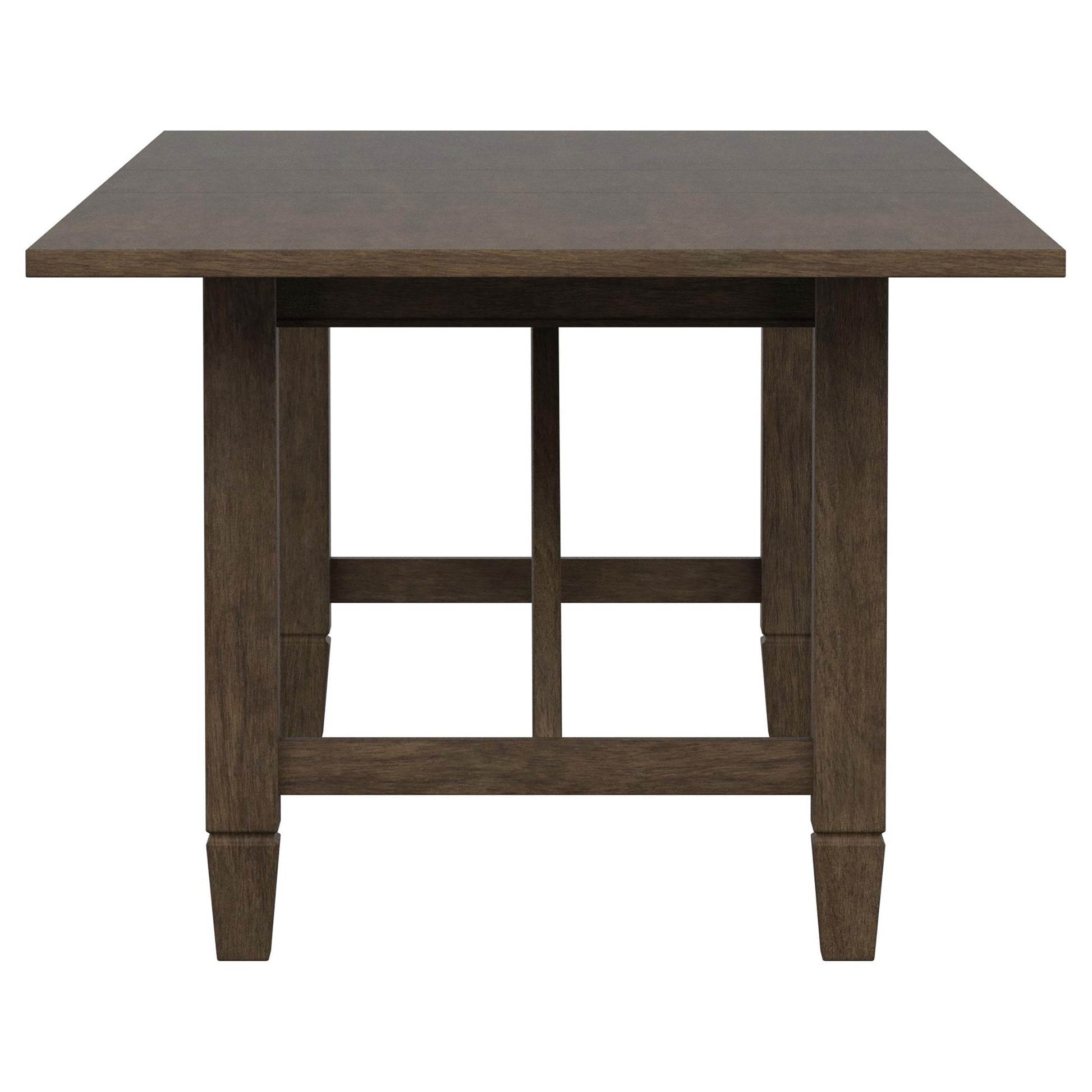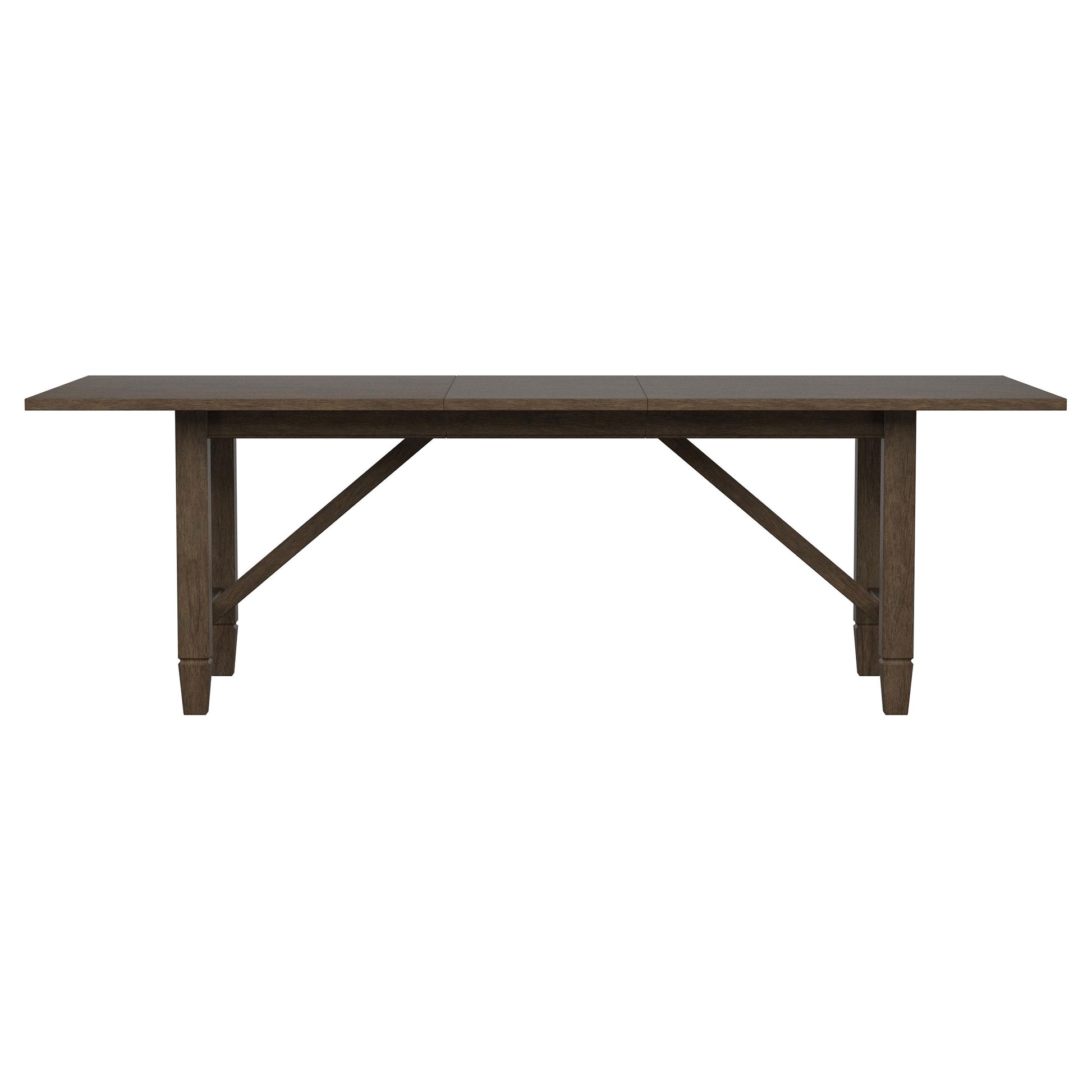 • Warm, natural brown wood grain finish pairs with a trestle-style table base