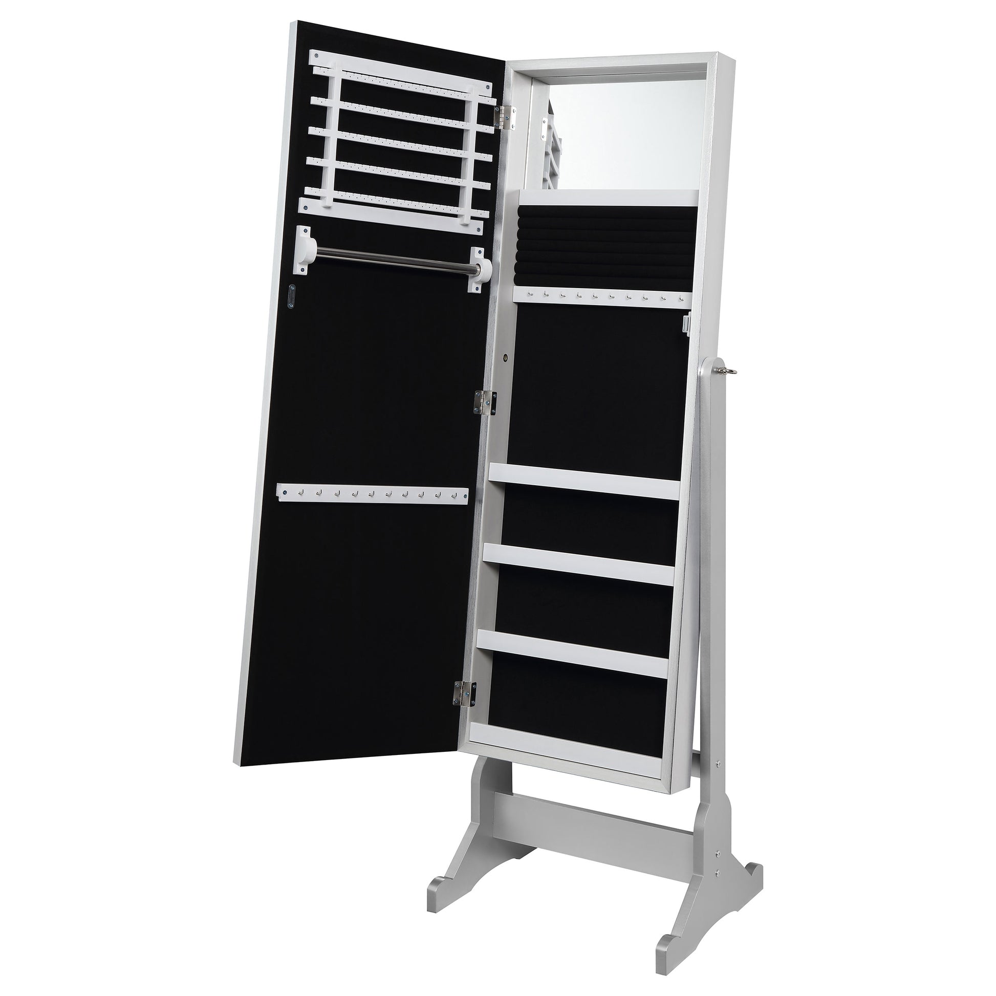 Put the finishing touch on a glamourous bed or dressing room with this stunning floor-length jewelry cheval mirror. Sleek and smooth, the frame features a metallic silver finish. Supportive and intriguing, the delicately curved legs give this mirror its chic personality. Brighten up a space with the light up mirror while keeping your favorite jewelry safe. Angle the mirror upwards or downwards in any bold or neutral decor scheme.