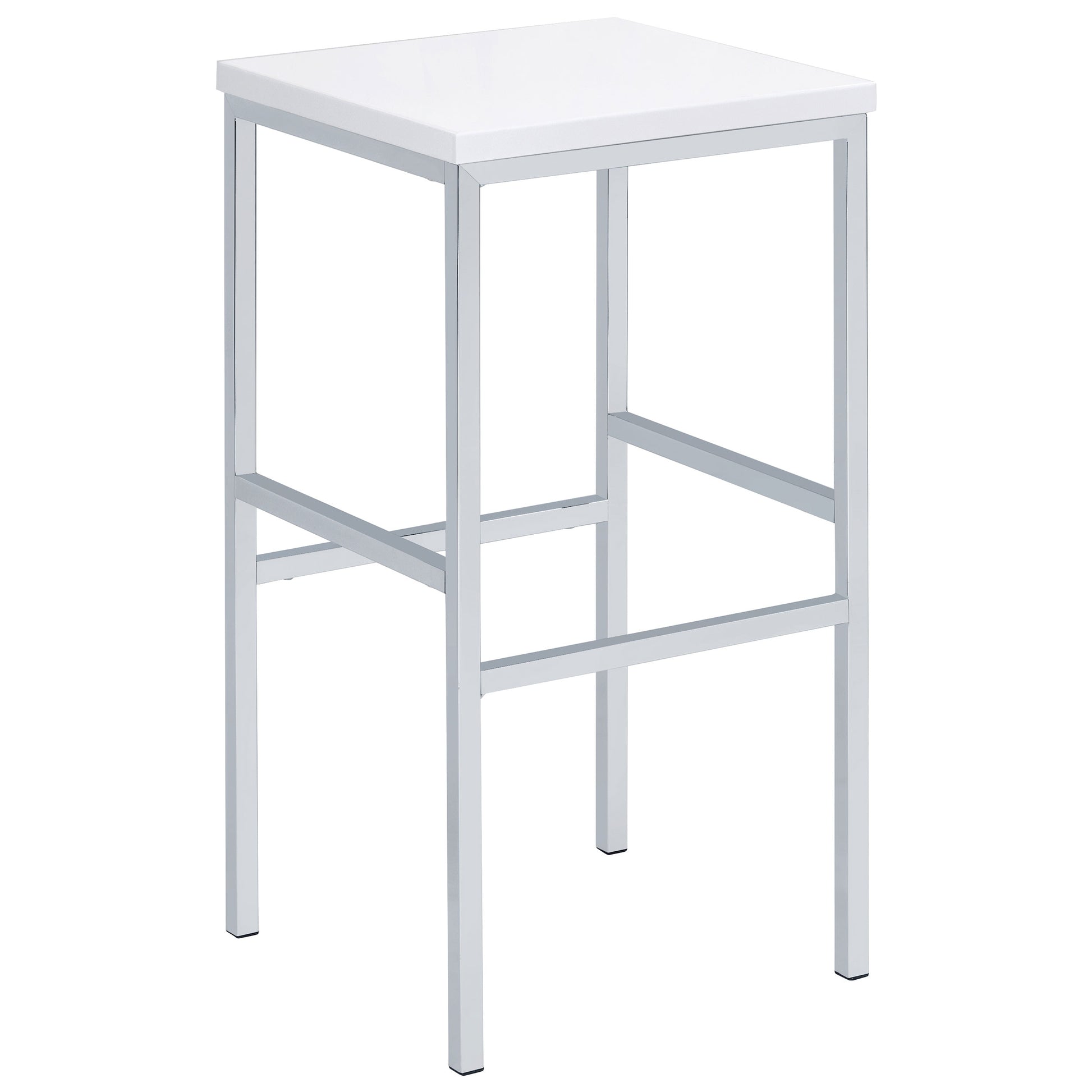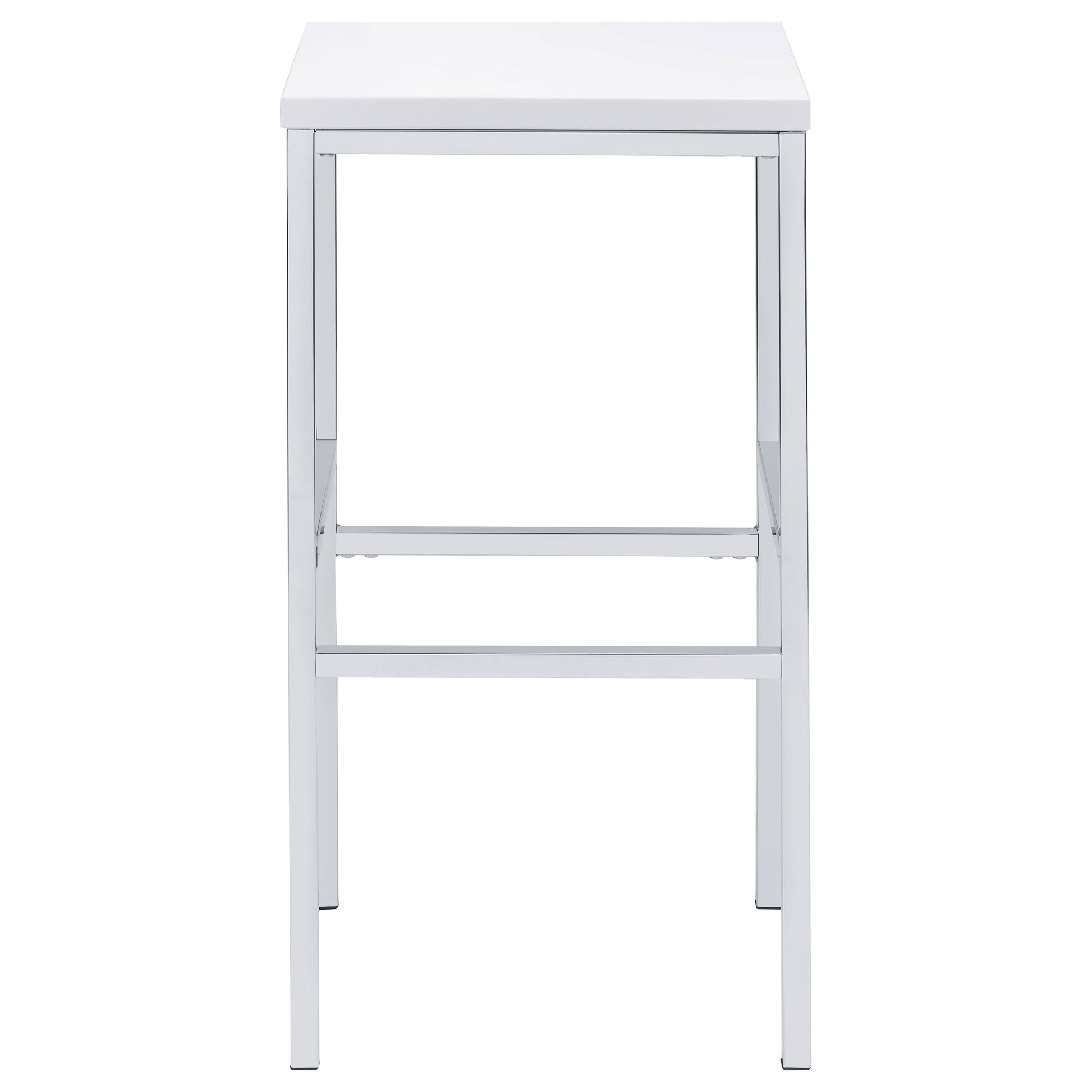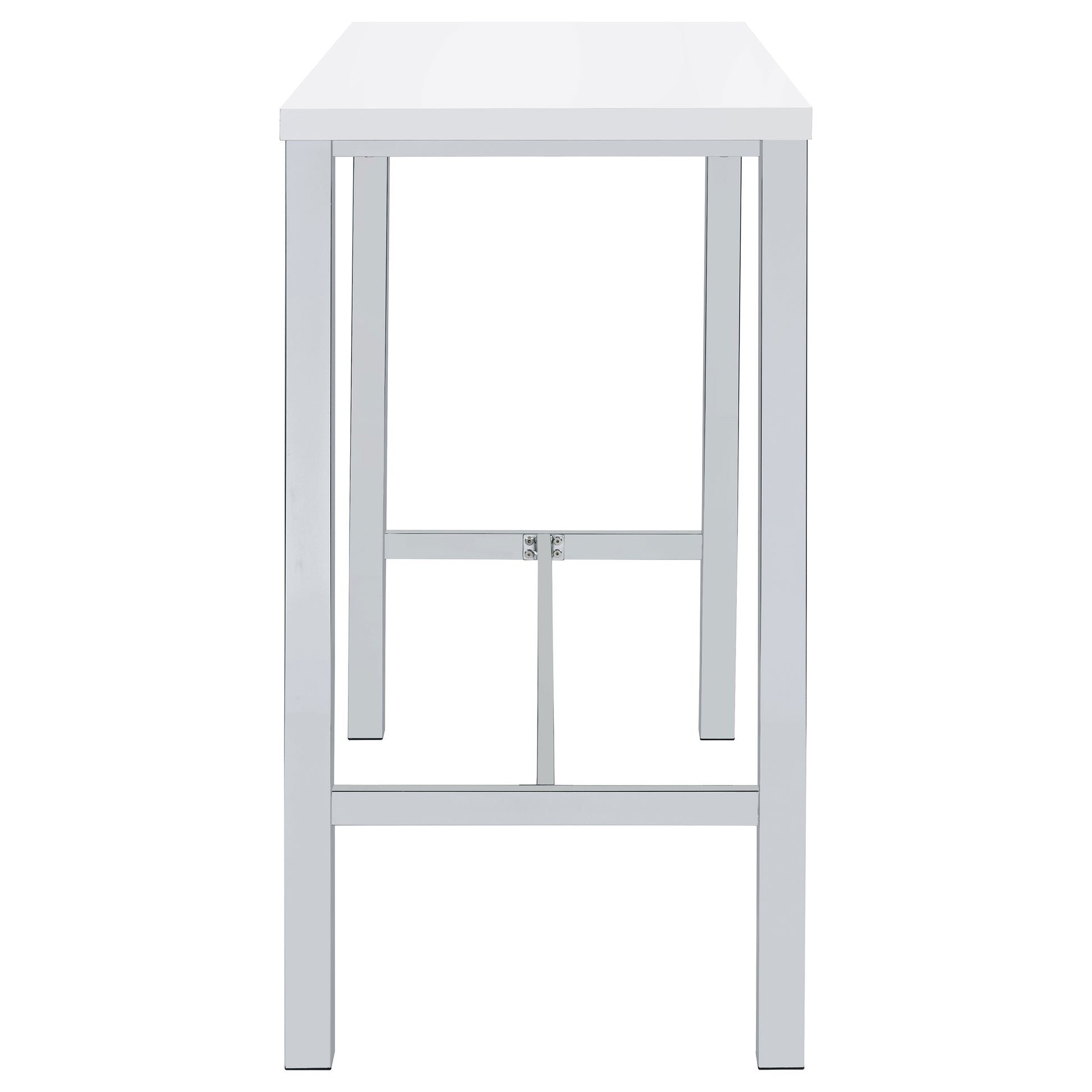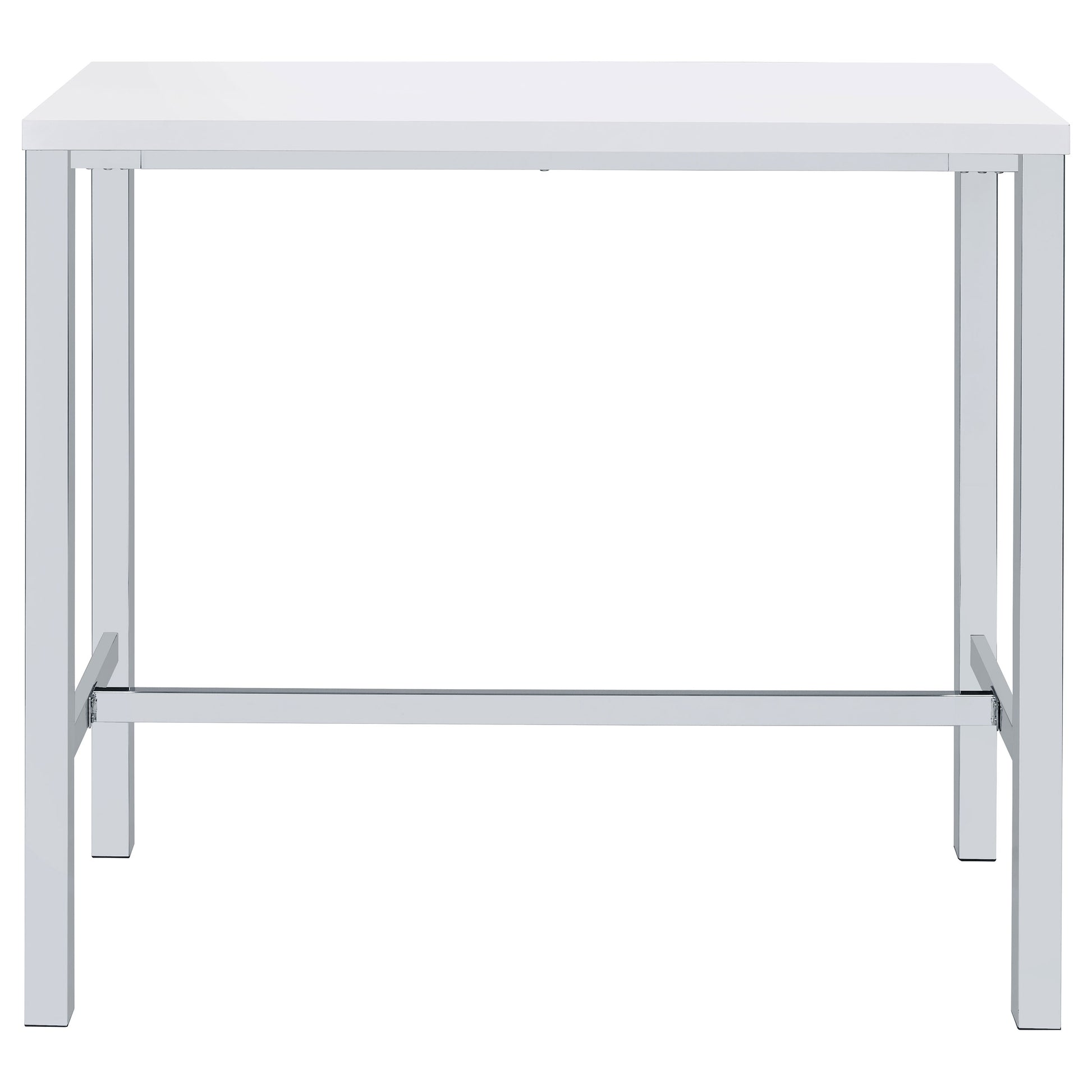Ultra-modern with a clean lined silhouette, this five-piece bar set comes complete with a rectangular shaped bar table and four bar stools. Perfect for more contemporary home, the table comes with sleek and square legs made and a steel frame in an electroplated and polished chrome finish that lends a luxurious gleam to any room. The tabletop features a high gloss white lacquer finish and seats four people comfortable. Each stool also features a matching lustrous high gloss white seat and matching legs. One the stools are also footrests for extra support and stability.