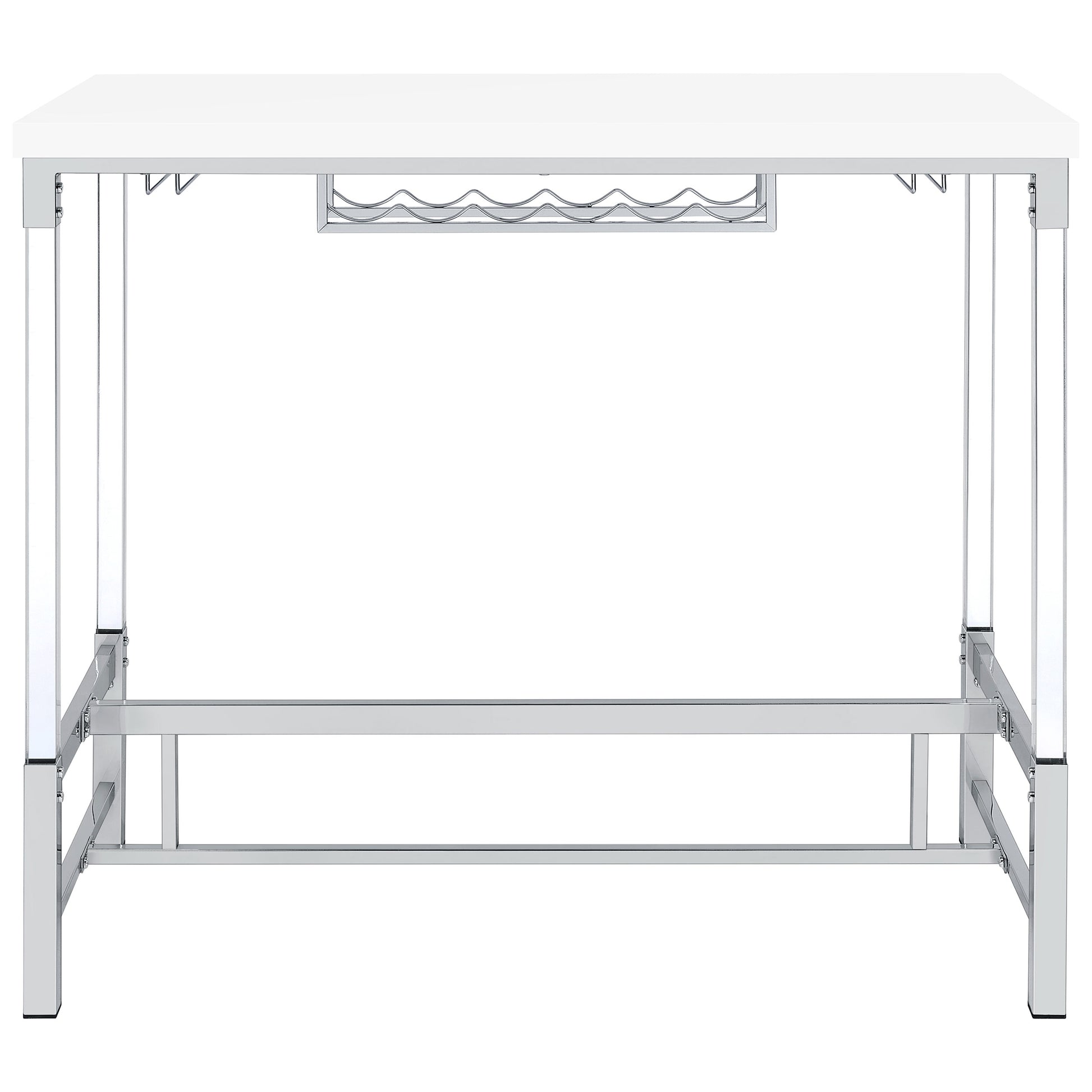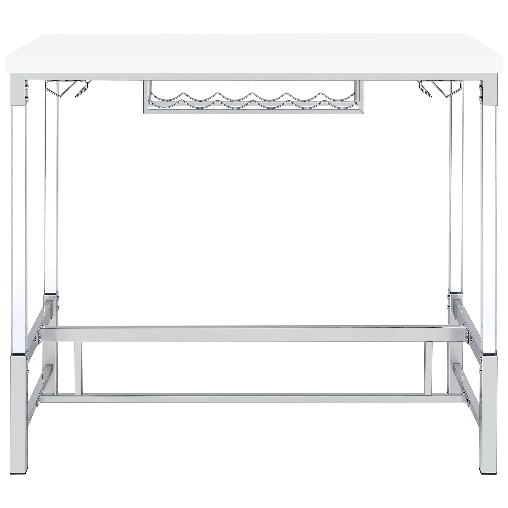 Create the ideal spot to share a bottle of wine with friends with a contemporary bar table. Perfect for two to four, it boasts a crisp, streamlined silhouette with an elevated tabletop in a bright white finish. The base features a silver finish and trestle details. Acrylic legs add a sense of light, airy ambiance, perfect for a compact nook or dining room. The table includes a built-in six-bottle wine rack and two stemware racks that make pouring a glass of your favorite vintage simple and easy.