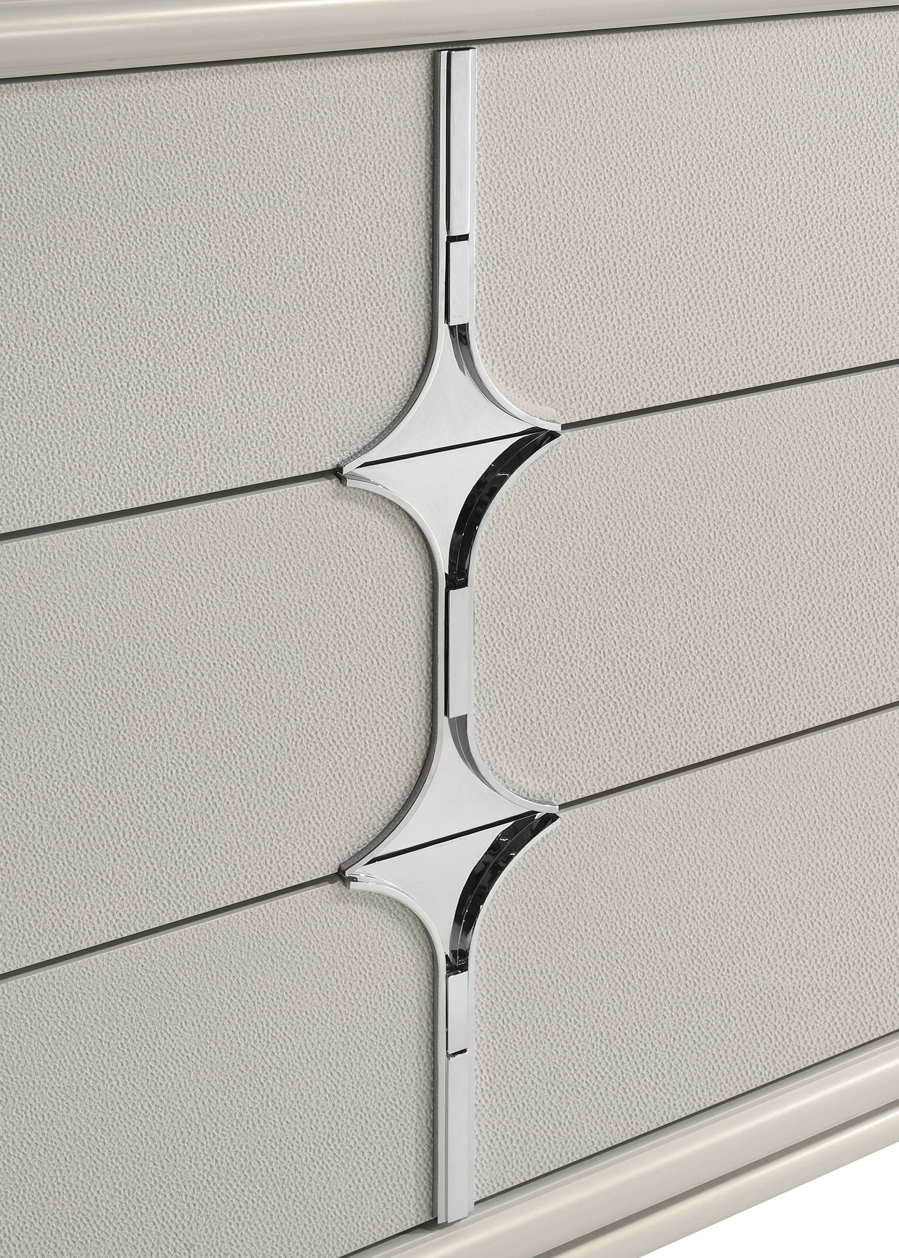 Enhance your bedroom’s allure with this exquisite 6-drawer dresser, a masterpiece of modern design and practical elegance. The pearl white finish, complemented by mirror framing and unique diamond star drawer fronts, exudes sophistication. Special features like the removable jewelry tray in a secret drawer and polished chrome accents elevate this dresser to a class of its own. With ample storage and finger tab chrome metal pulls, this piece combines functionality with style. Make a statement in your bedroom with this captivating dresser.