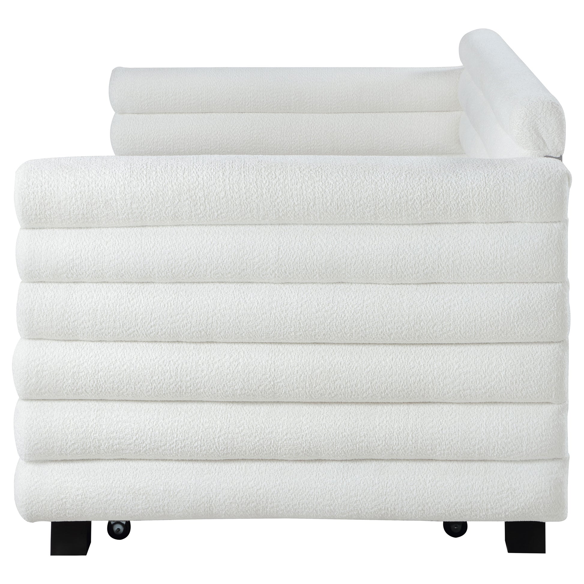 You're going to love the intriguing silhouette and boucle upholstery featured on this modern daybed and trundle. Offering contemporary flair, the daybed is designed with layered round bolsters, creating exceptional texture and dimensionality in your living room or den. Boucle upholstery is fresh and modern, creating inviting texture and character. The bed and trundle are twin-sized, offering easy lounging on a daily basis, or creating space for a pair of overnight guests. This stylish daybed offers the perfect combination of impressive style and wonderful versatility.