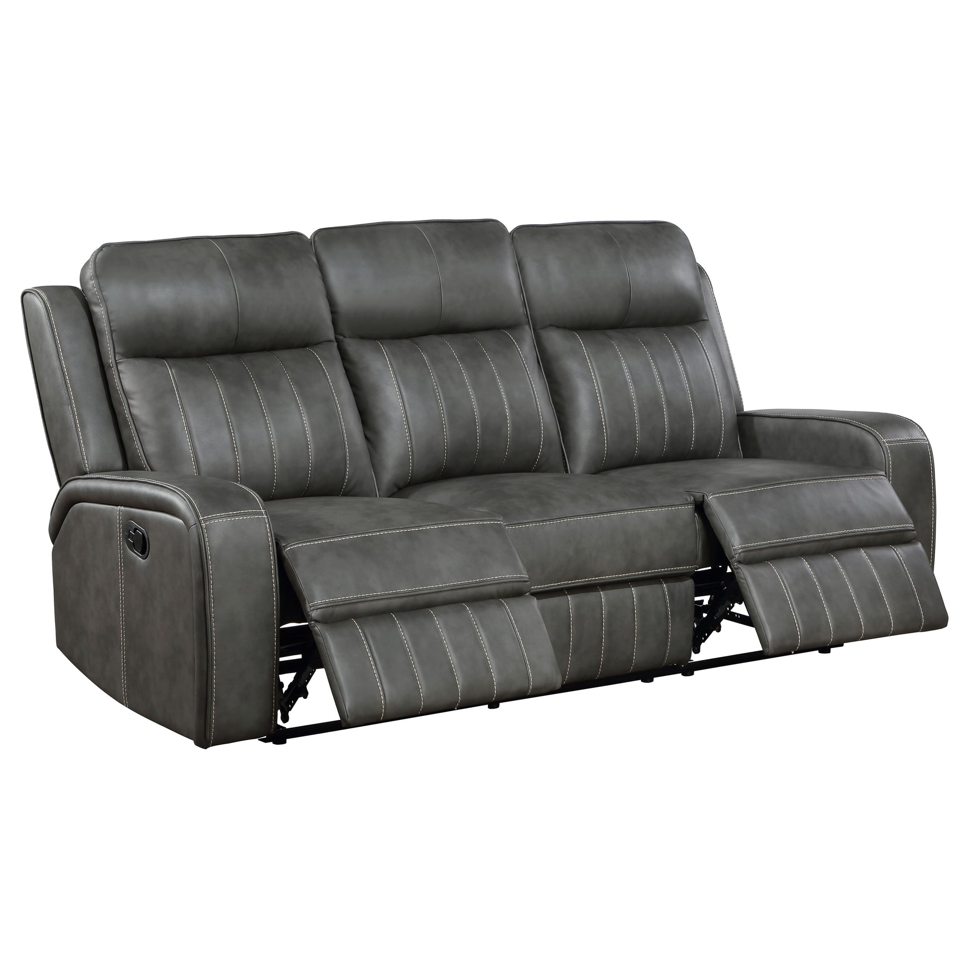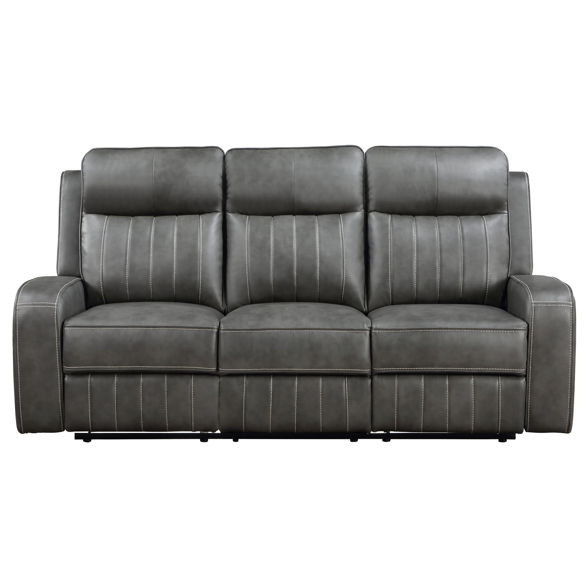 Relax in style with this transitional motion sofa set that blends modern and contemporary design. Each piece is upholstered in smooth grey leatherette with vertical topstitching for decorative detail and added dimension. Plush foam padding and pocket coil seating provide long-lasting support, while ultra-padded headrests enhance comfort. Manual reclining seats with a wall-hugger design maximize space efficiency. For added functionality, the loveseat includes a center storage console with dual cup holders.