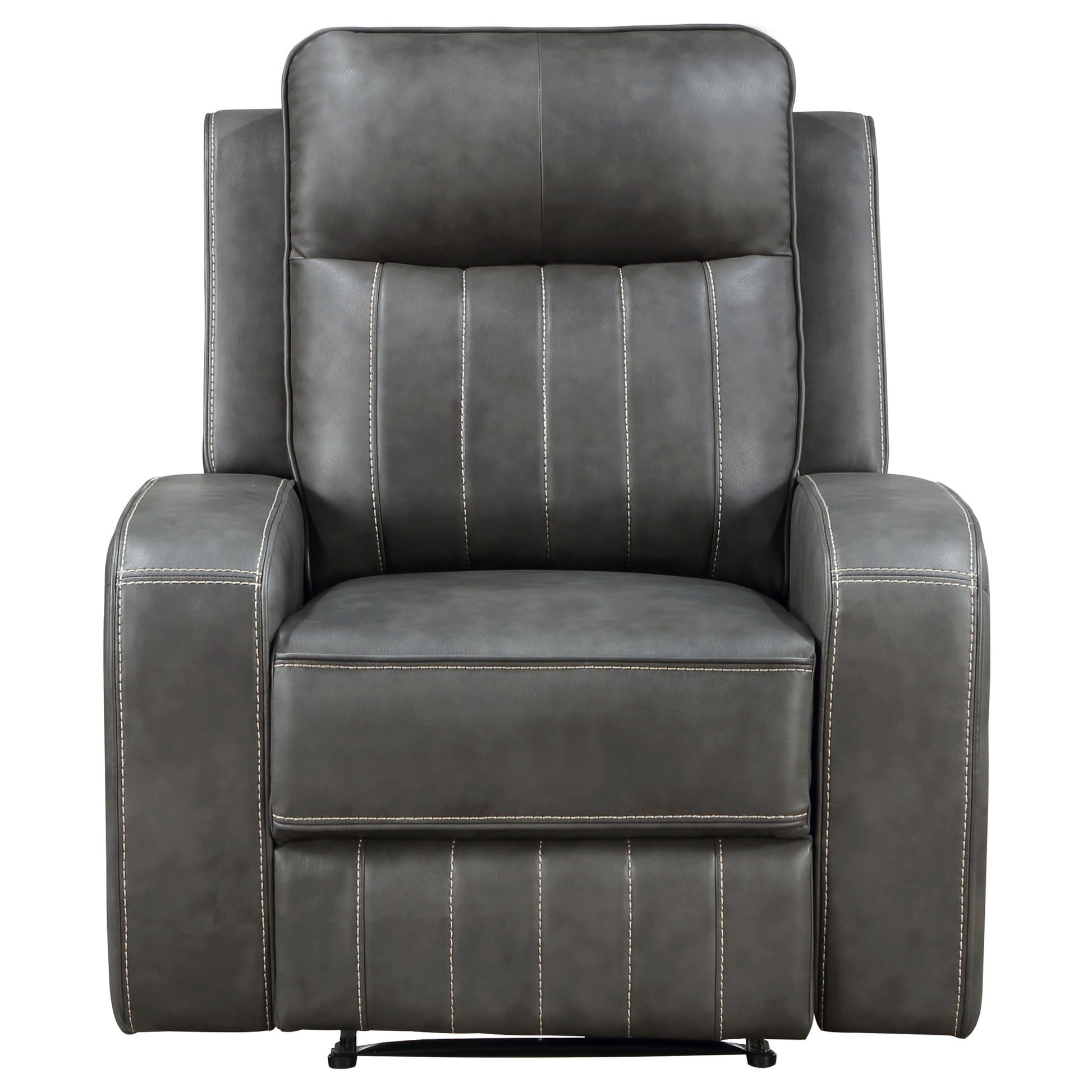 Settle into comfort with this transitional recliner, blending modern lines with timeless appeal. Upholstered in smooth grey leatherette, it features vertical topstitching that adds depth and dimension. Plush foam padding and pocket coil seating provide supportive comfort, while an attached back cushion and ultra-padded headrest create the perfect spot for relaxation. A manual reclining mechanism offers multiple positions, and a wall-hugger design maximizes space efficiency, making this chair a smart choice for any living room.