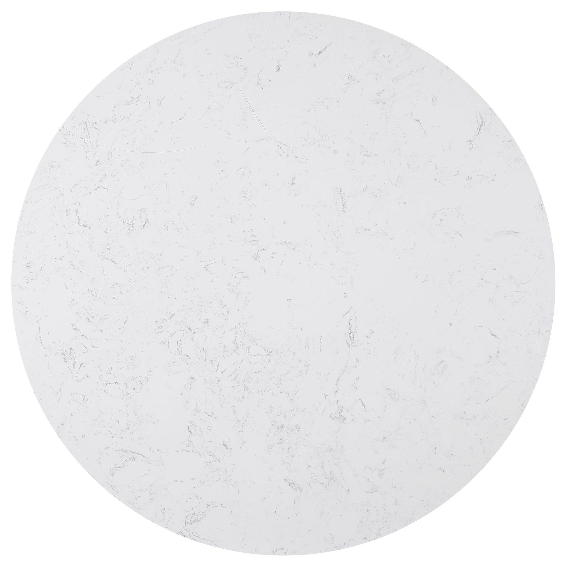 This elegant, contemporary, five-piece dining set completes formal dining experiences with a round, white, cultured marble, and rustic espresso pedestal table and four upholstered parson style side chairs. Charming details like button-tufted rolled backrests, bold nailhead trim, and flared legs lend a classical approach with modern elements.