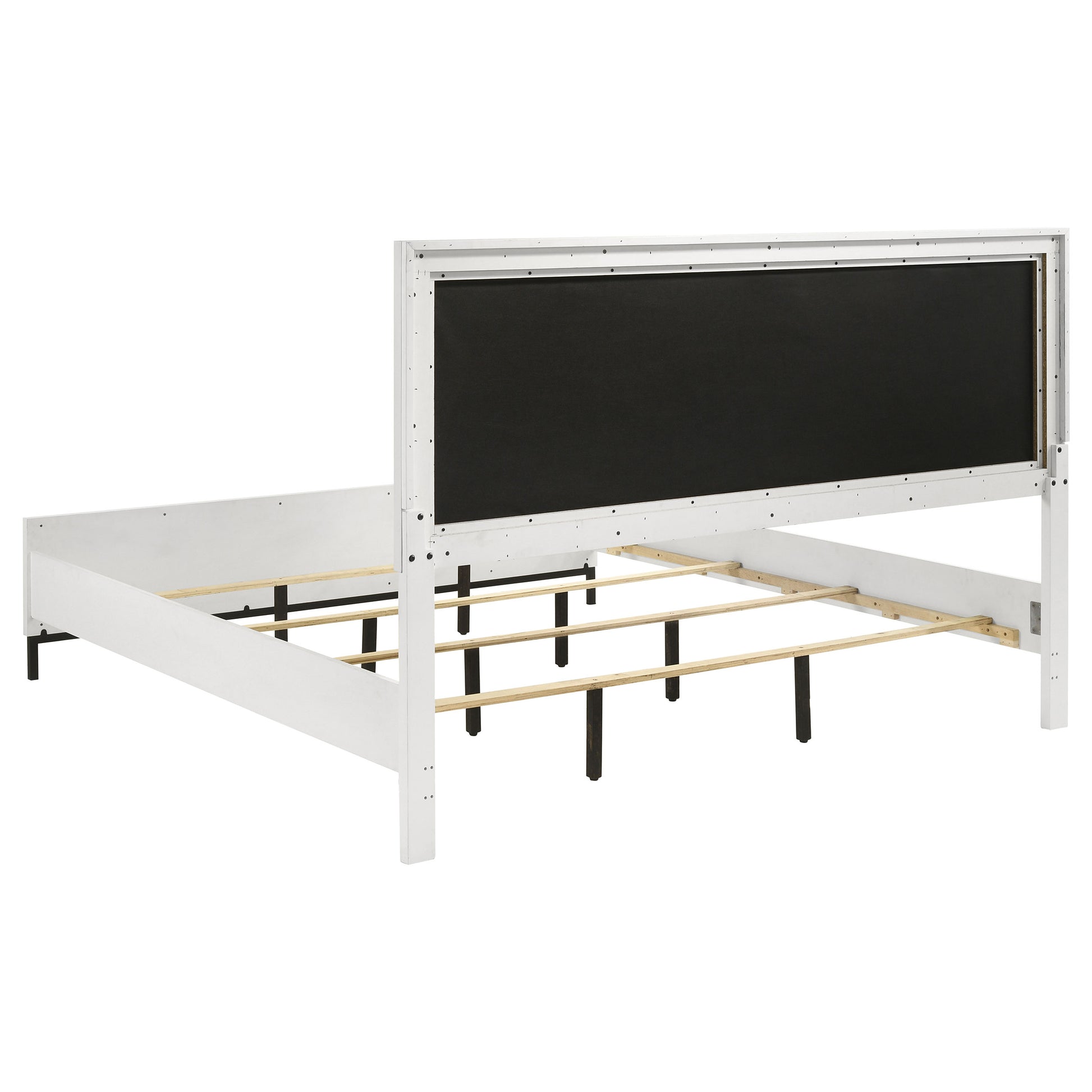 Delivering the perfect mix of style and functionality, this five-piece modern bedroom set centers on an upholstered bed and includes a nightstand, chest, and dresser and mirror. Delivering a bright white finish, the set offers light, airy ambiance, perfect for an open bedroom design. The bed boasts a padded headboard complete with hexagonal tufting in dark gray fabric upholstery. The low footboard adds to its open presentation while black accents coordinate with storage pieces that feature long bar handles on drawers. Offering plenty of space for clothing and accessories, the set creates clean, crisp aesthetics in your stylish bedroom.