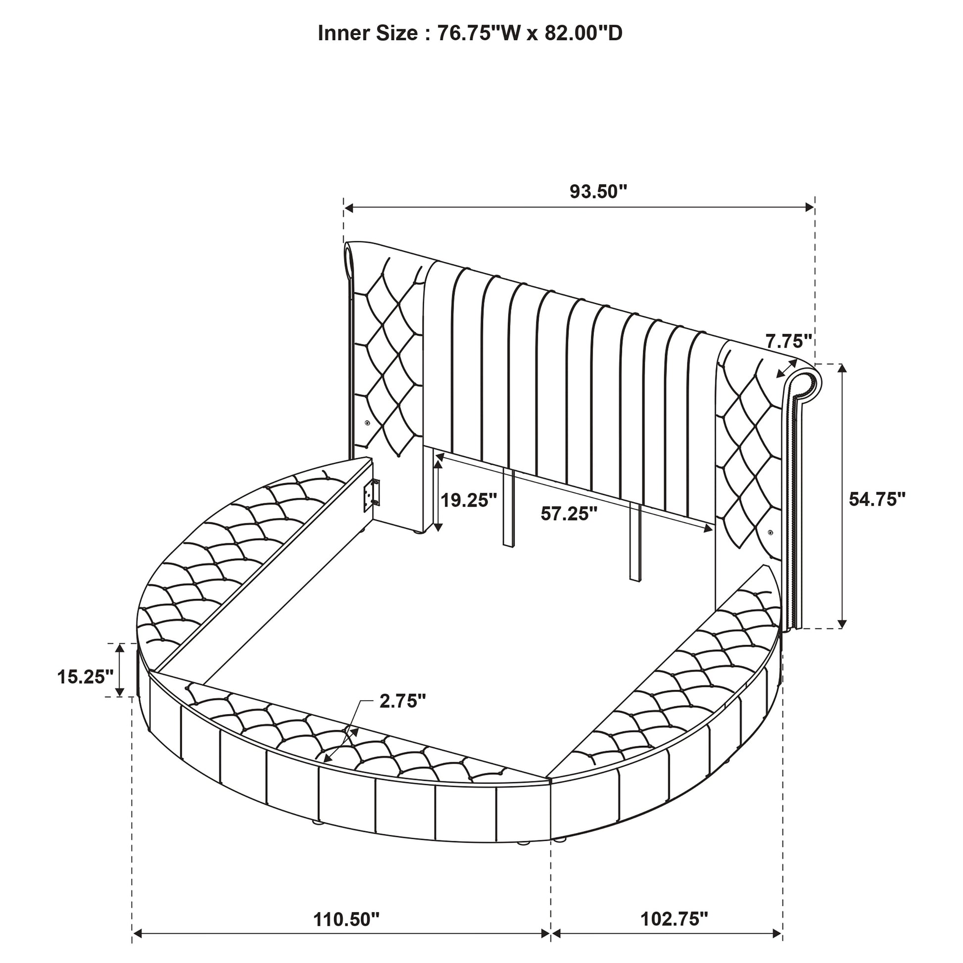 • Round bed features a fully upholstered frame with hidden storage beneath lift-up panels