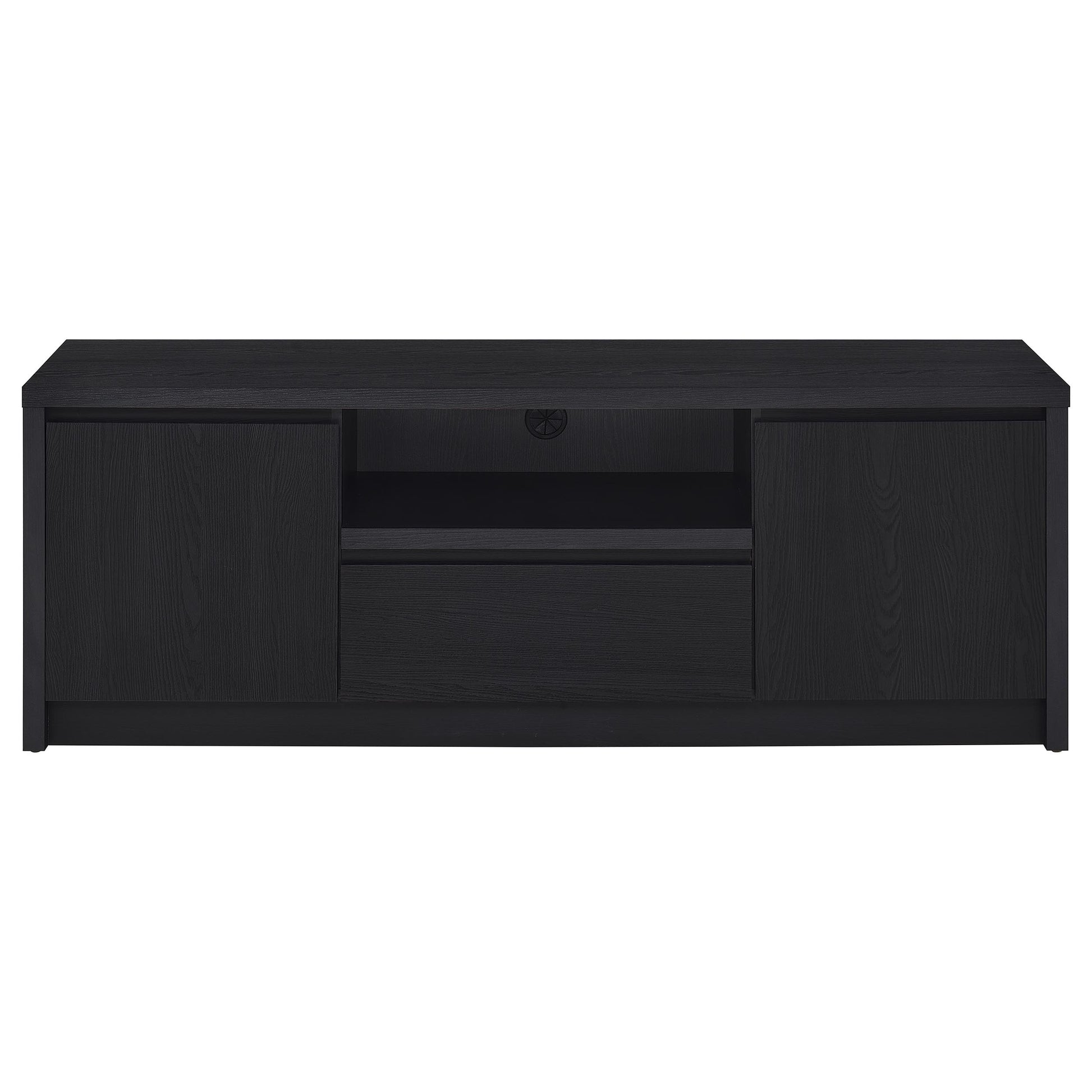 This sleek entertainment center combines a contemporary black finish with practical storage solutions. Made from durable engineered wood, it’s topped with a scratch-resistant eco-friendly laminate veneer. The unit includes two cabinets for concealed storage, an open shelf with a cable management hole for media devices, and a spacious drawer for organization. Its sturdy construction and modern silhouette make it a versatile piece for any entertainment setup.